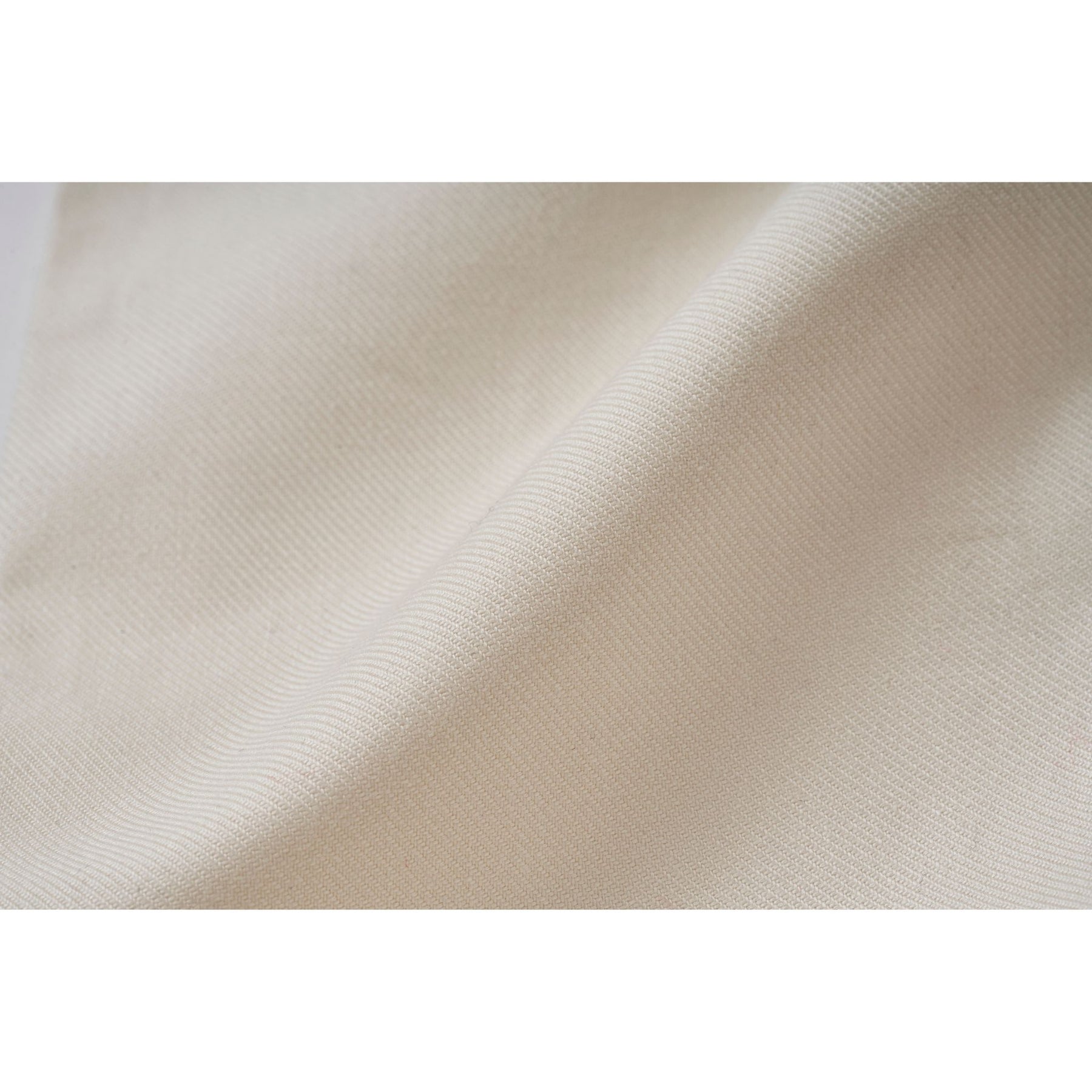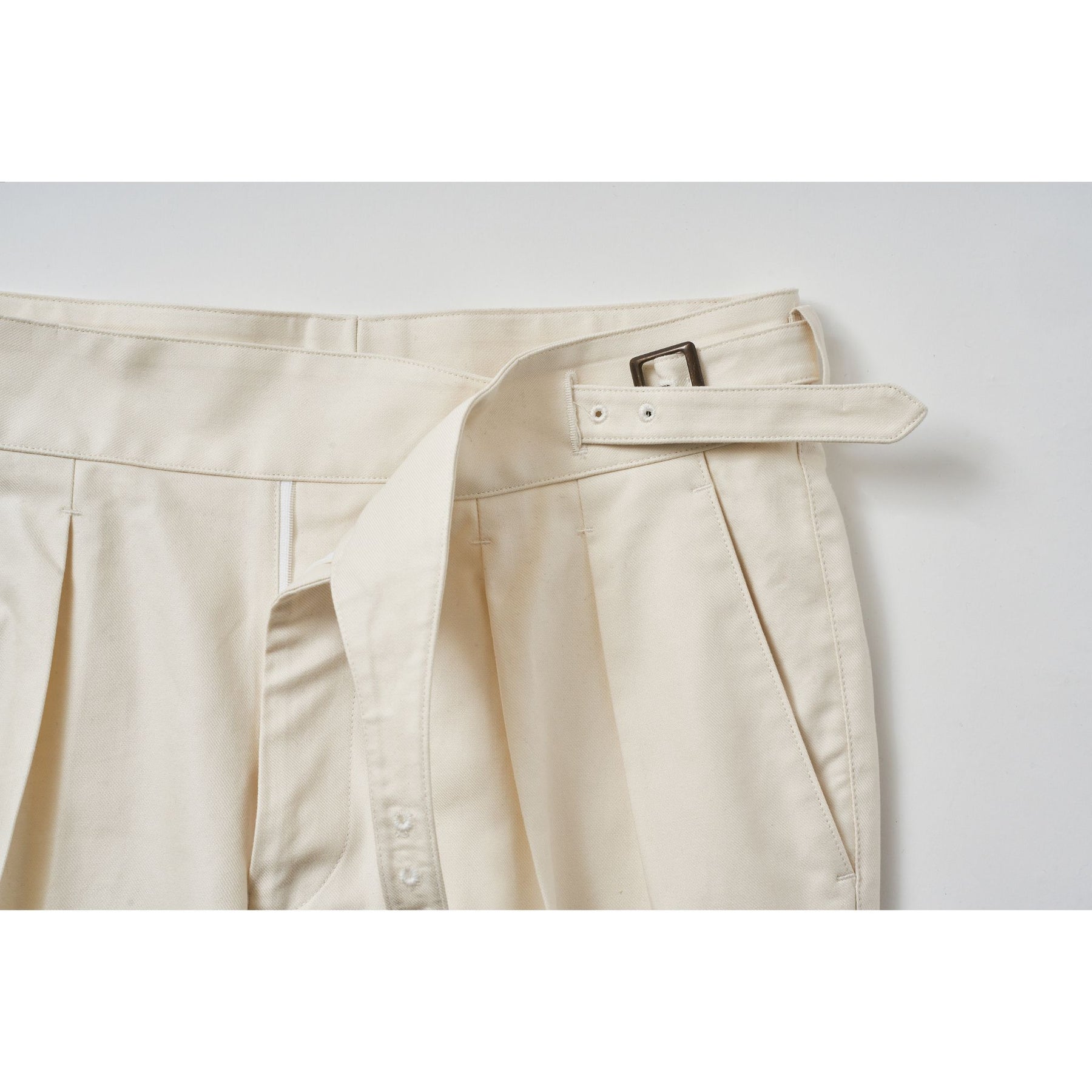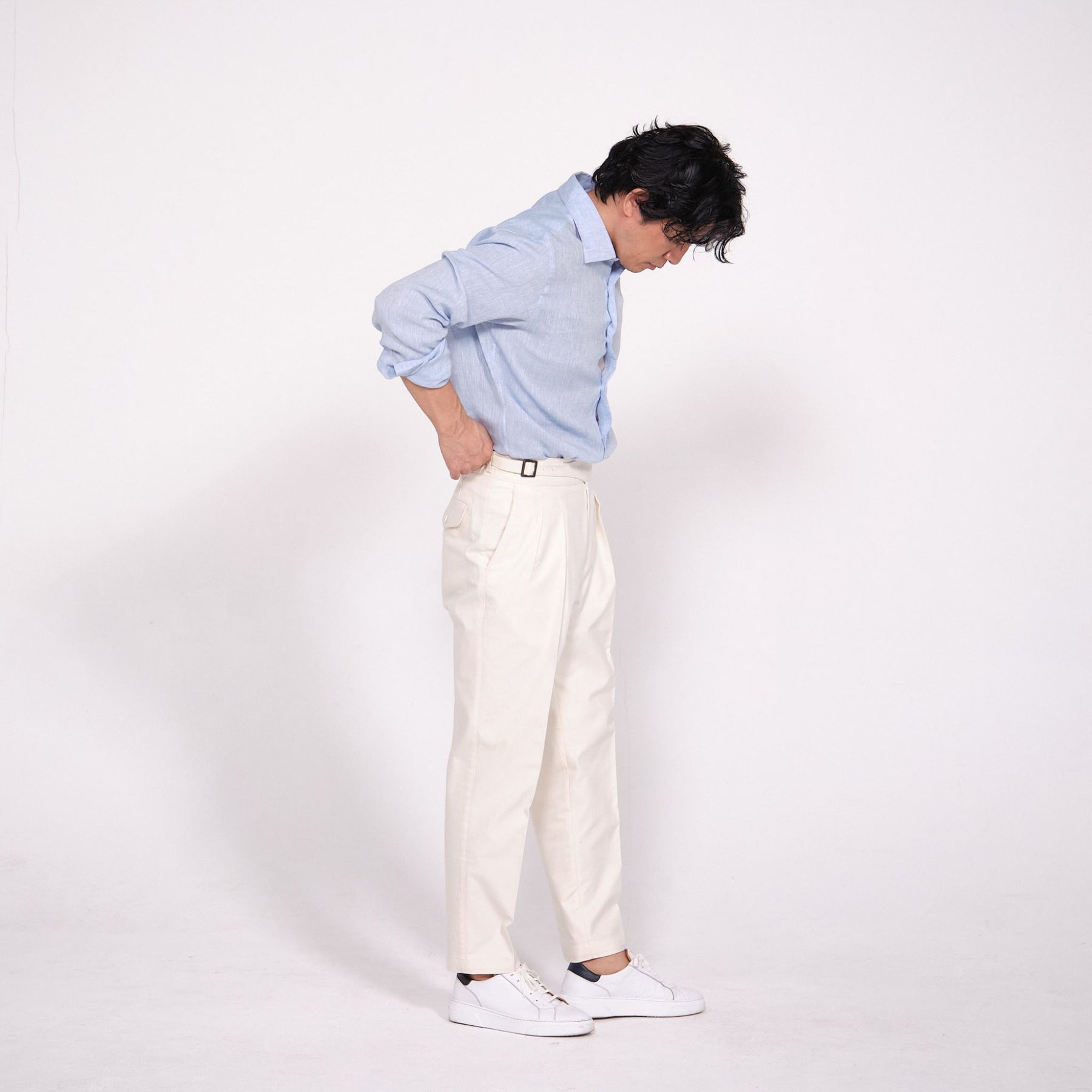 ■生地:生地は武骨なハリと、大人の色気を両立させるミリタリーサージ採用したのは、かつて軍服に使用されていたサージ組織を現代的に再構築したミリタリーサージ SB3401-1。高強力糸を高密度に織り上げることで、ドライで清涼感のあるタッチ。粗野さを抑えたクリアな表面感で立体的なシルエットを支える適度なハリを高次元で両立しています。わずかにニュアンスを含んだアイボリーホワイトは、軽快さがありながらもしっかりとした肉感を備え、春夏シーズンでも透けを気にせず穿ける安心感も魅力です。