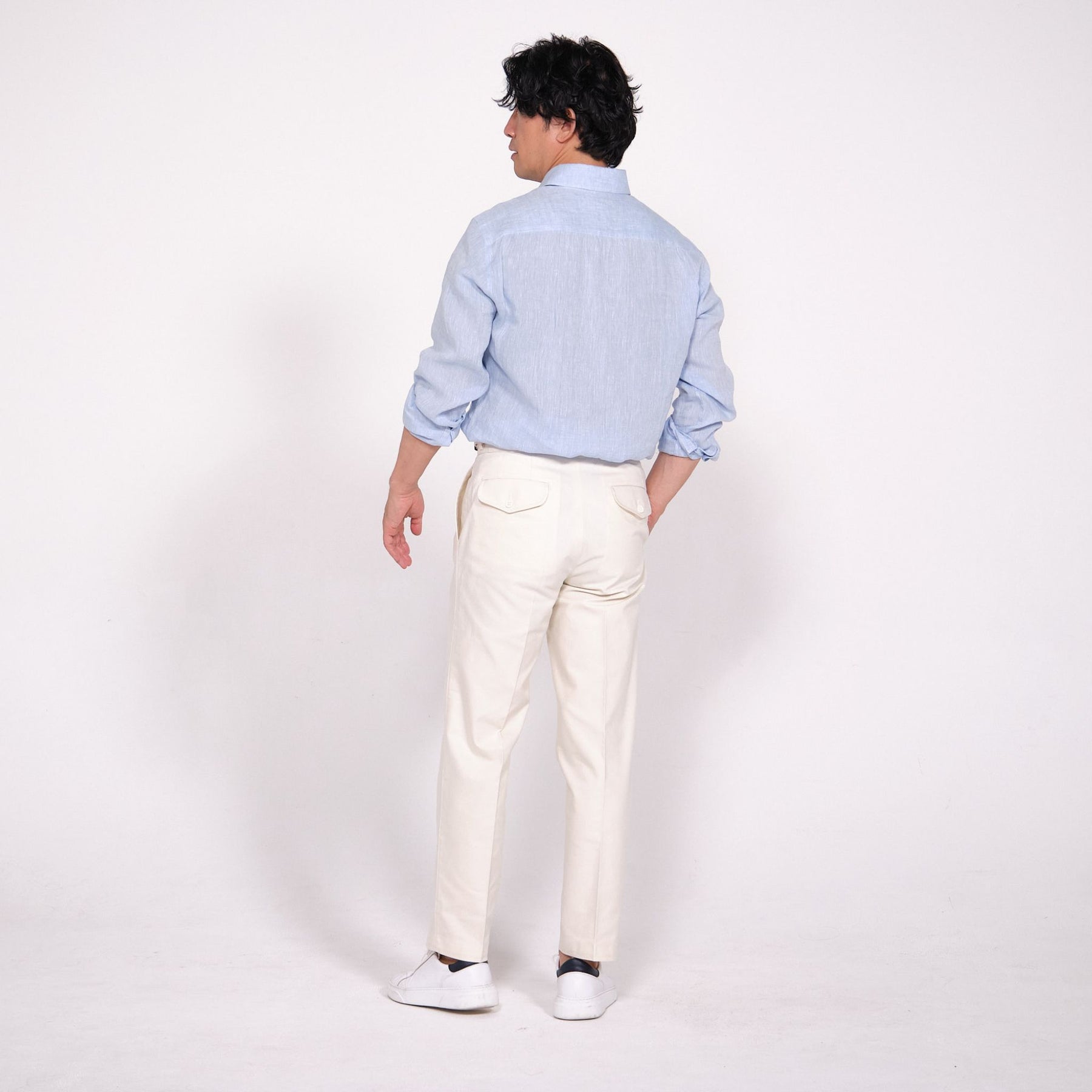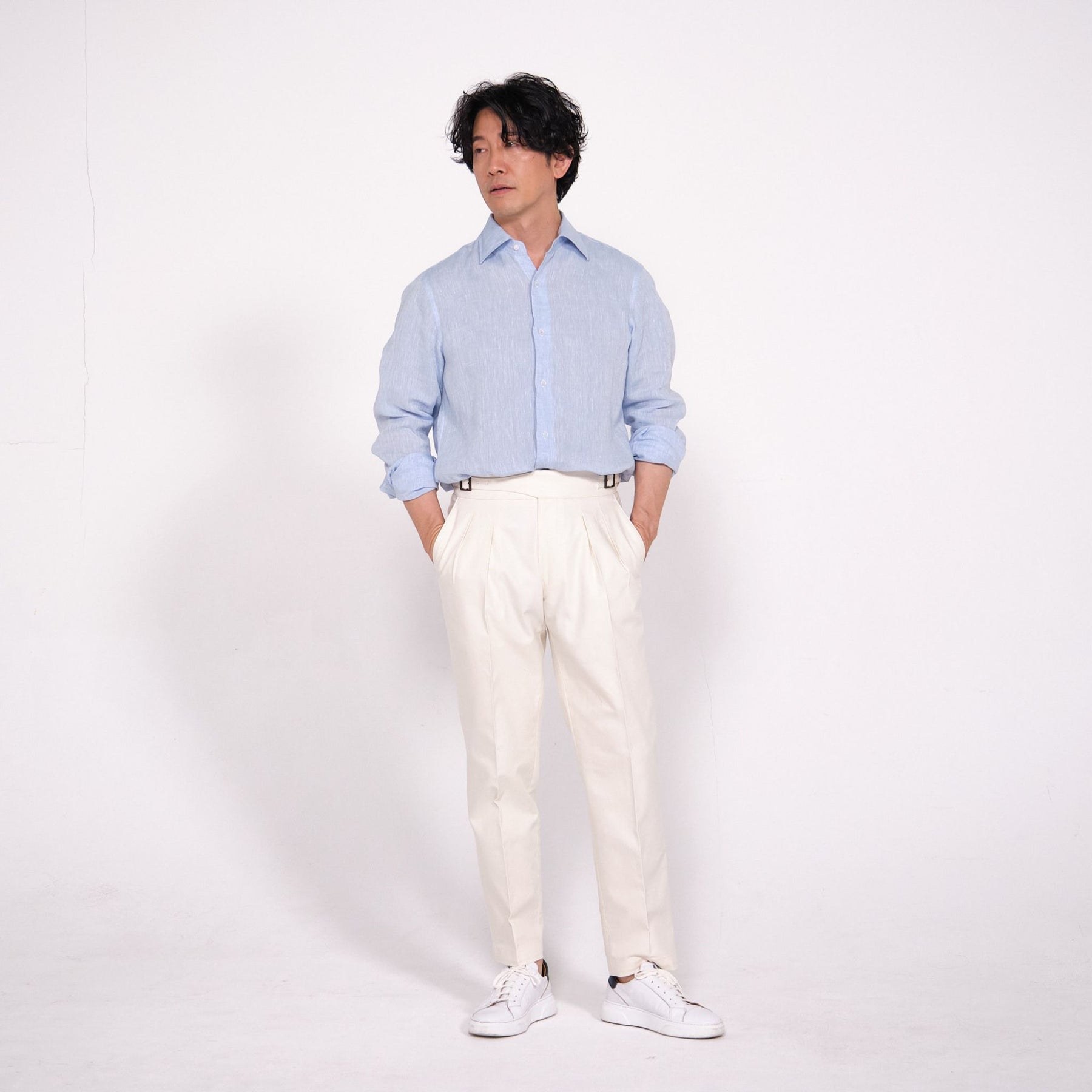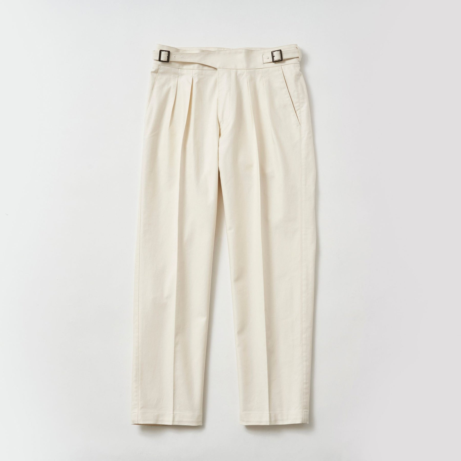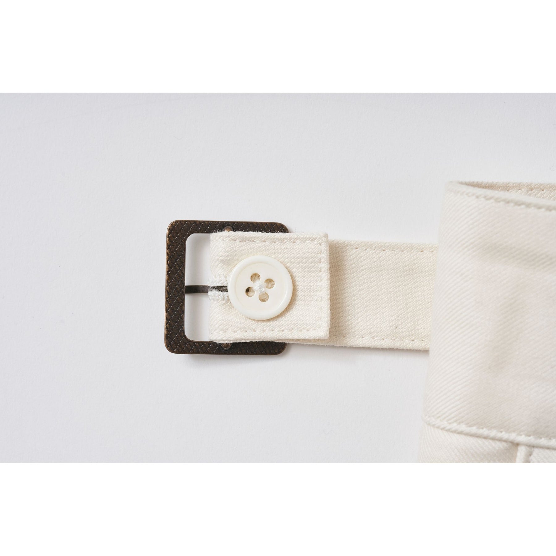 ■生地:生地は武骨なハリと、大人の色気を両立させるミリタリーサージ採用したのは、かつて軍服に使用されていたサージ組織を現代的に再構築したミリタリーサージ SB3401-1。高強力糸を高密度に織り上げることで、ドライで清涼感のあるタッチ。粗野さを抑えたクリアな表面感で立体的なシルエットを支える適度なハリを高次元で両立しています。わずかにニュアンスを含んだアイボリーホワイトは、軽快さがありながらもしっかりとした肉感を備え、春夏シーズンでも透けを気にせず穿ける安心感も魅力です。
