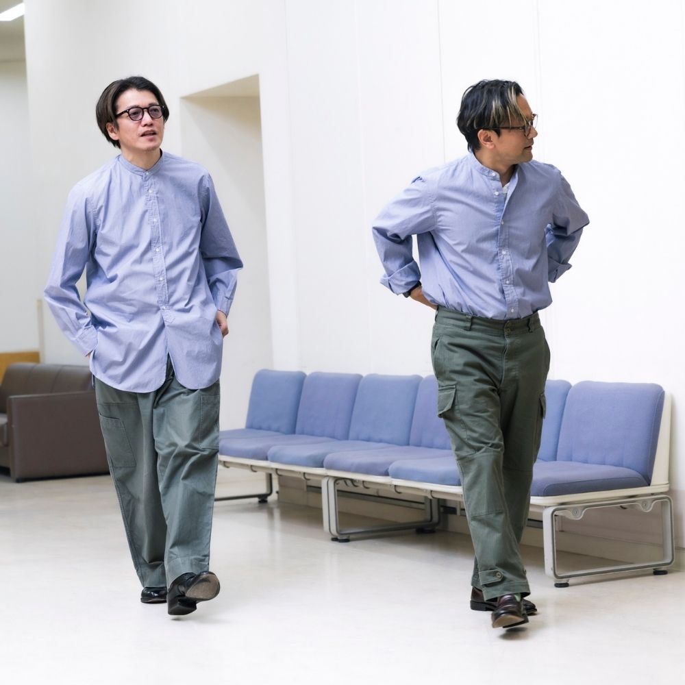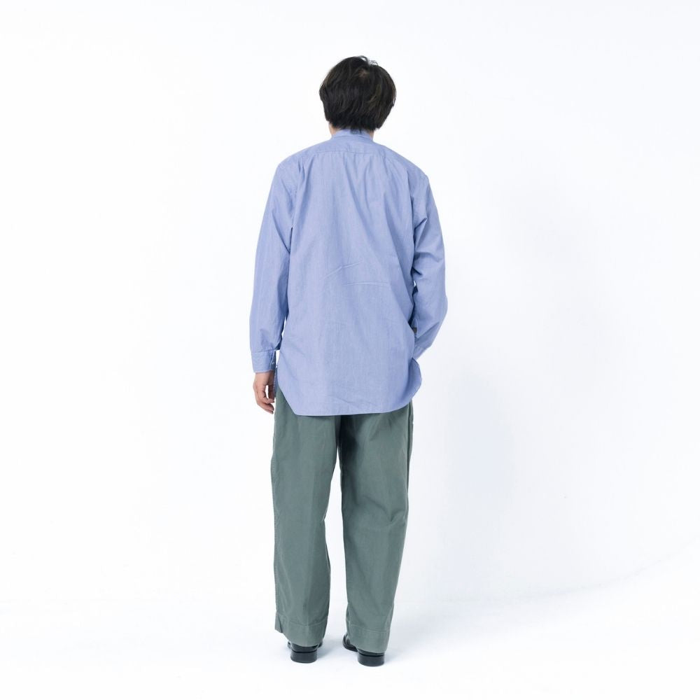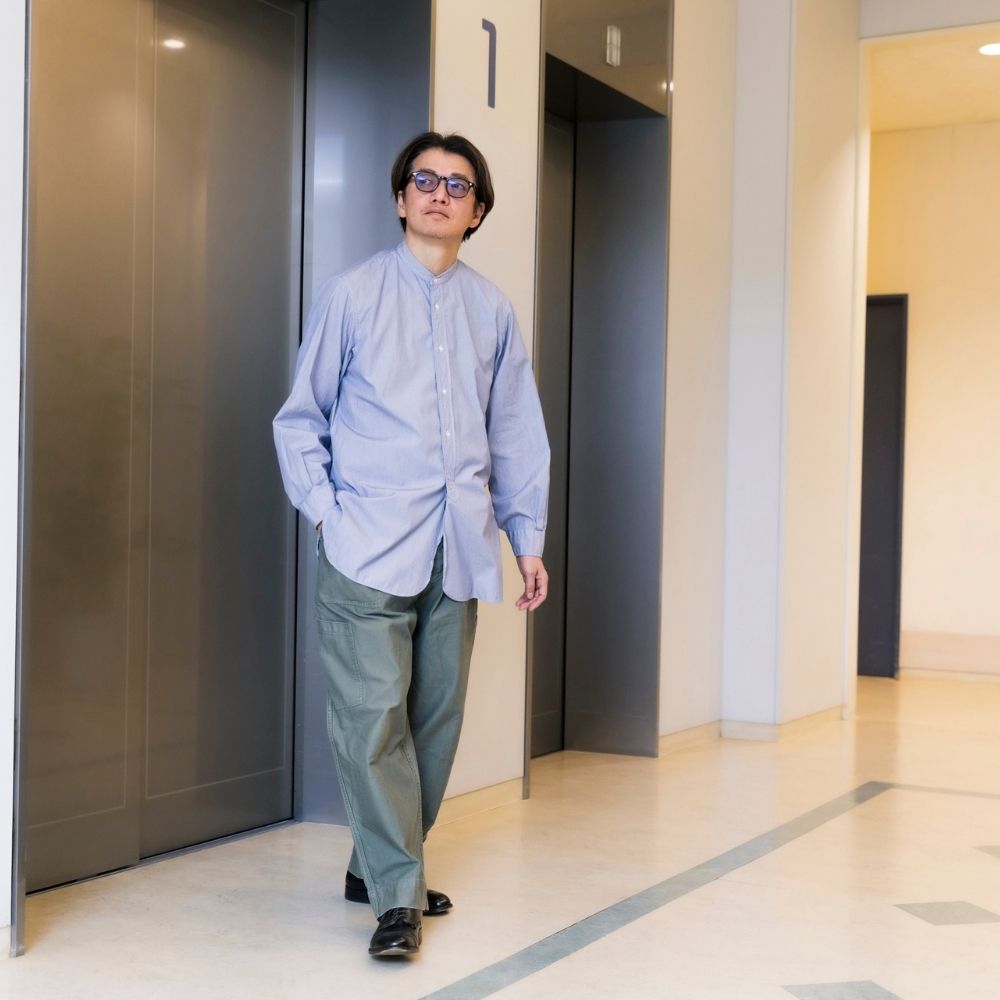 付け襟を前提としたバンドカラー、深いスリットとガゼット、トラウザーインを前提に設計された長めの着丈。すべてが「意味のあるディテール」として機能する一着です。クラシックを知る大人が、あえて“今”選ぶべきネオ・ミリタリーシャツが完成しました。