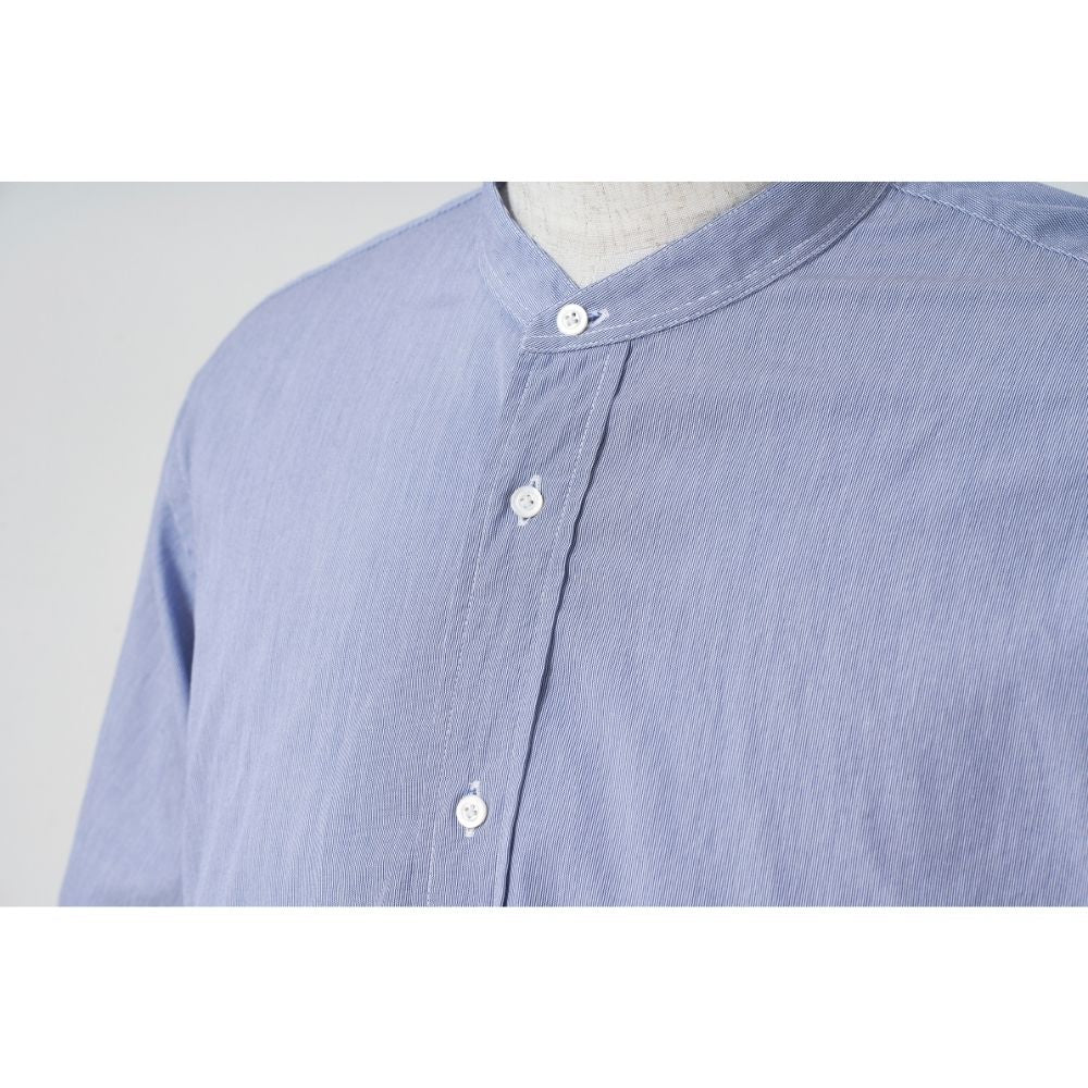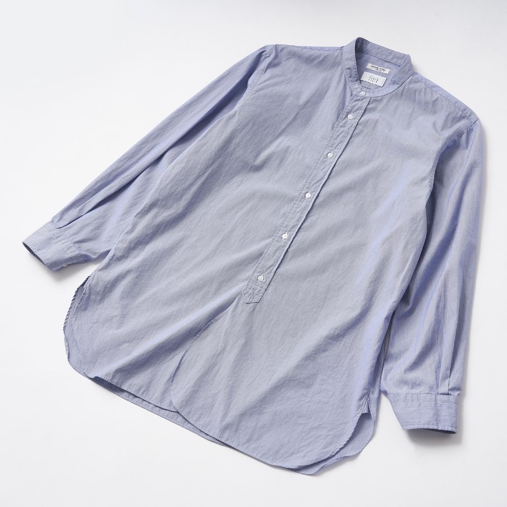 バンドカラー(襟なし)仕様において、前後に残したボタンホールは、汚れやすい衿だけを外して洗うという、かつて付け襟(デタッチャブルカラー)を装着していた名残。鳥足掛けボタンは自然に傾き、片手でも留め外しがしやすい実用的仕様。すべてが「デザインのため」ではなく、機能から導かれた美しさです。