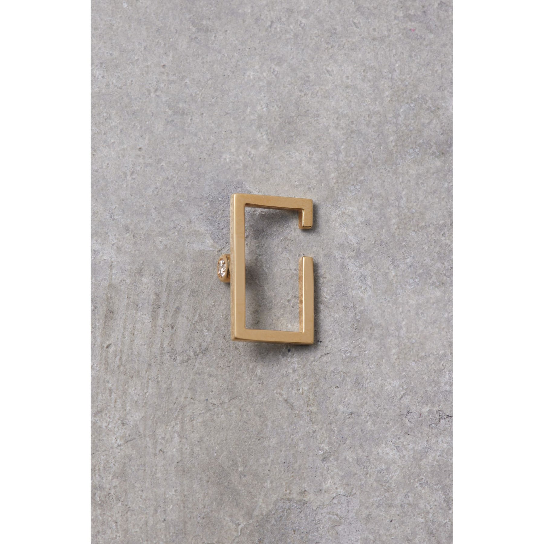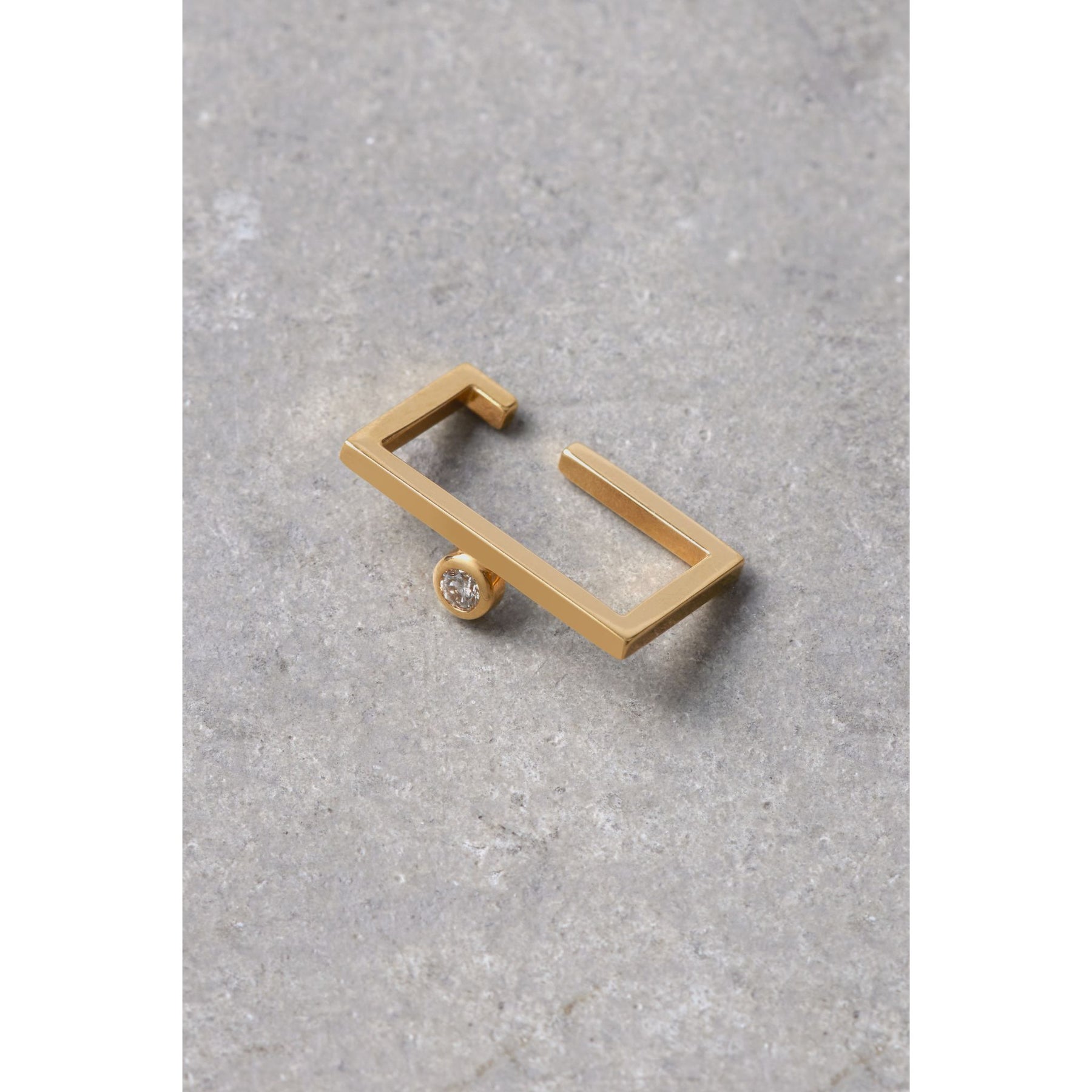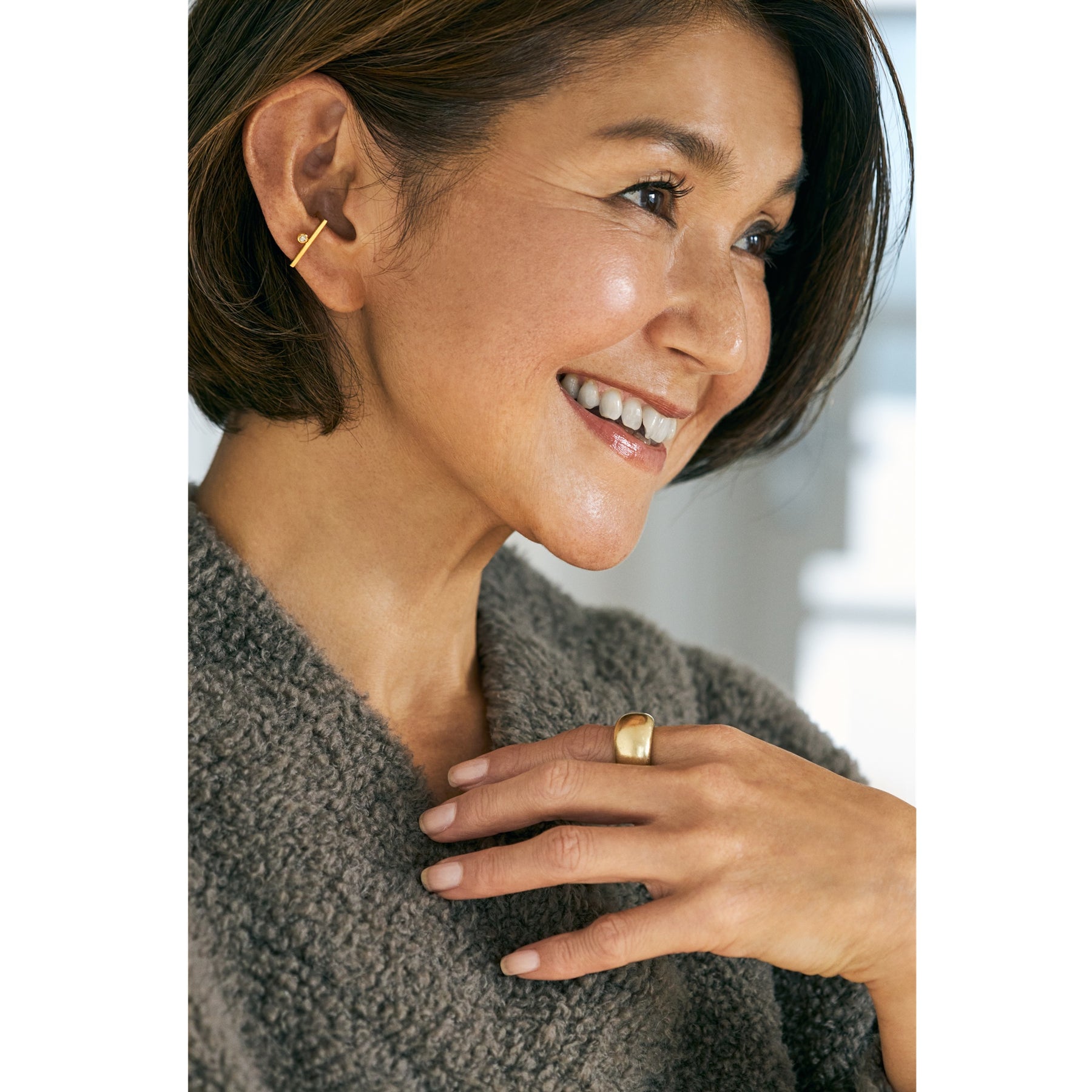 拘りは直線ライン。イヤカフのこの直線ラインが耳元にあることで、顔まわりの印象をキリっと整えて、ピアスやイヤリングよりも高い位置にあるので、目線も少しあがってフェイスラインもすっきり見える気がします。そして、左右どちらに着けても見える位置に天然のダイヤモンドを一粒セットしてもらいました。実はダイヤを入れるかどうか迷ったのですが、小さくても輝きのあるダイヤが入ることでさりげないアイキャッチになって、やっぱり入れて正解でした! ちょっと大きめサイズなのでこれ1個でも決まるし、手持ちのピアスやイヤリングとも合わせやすいんです。イヤカフってつけるのが難しそうだったり、高額だと挑戦しづらいアイテムでもありますが、ダイヤ付きで2万円台という手に取りやすい価格を実現してくださいました。」(松井さん)