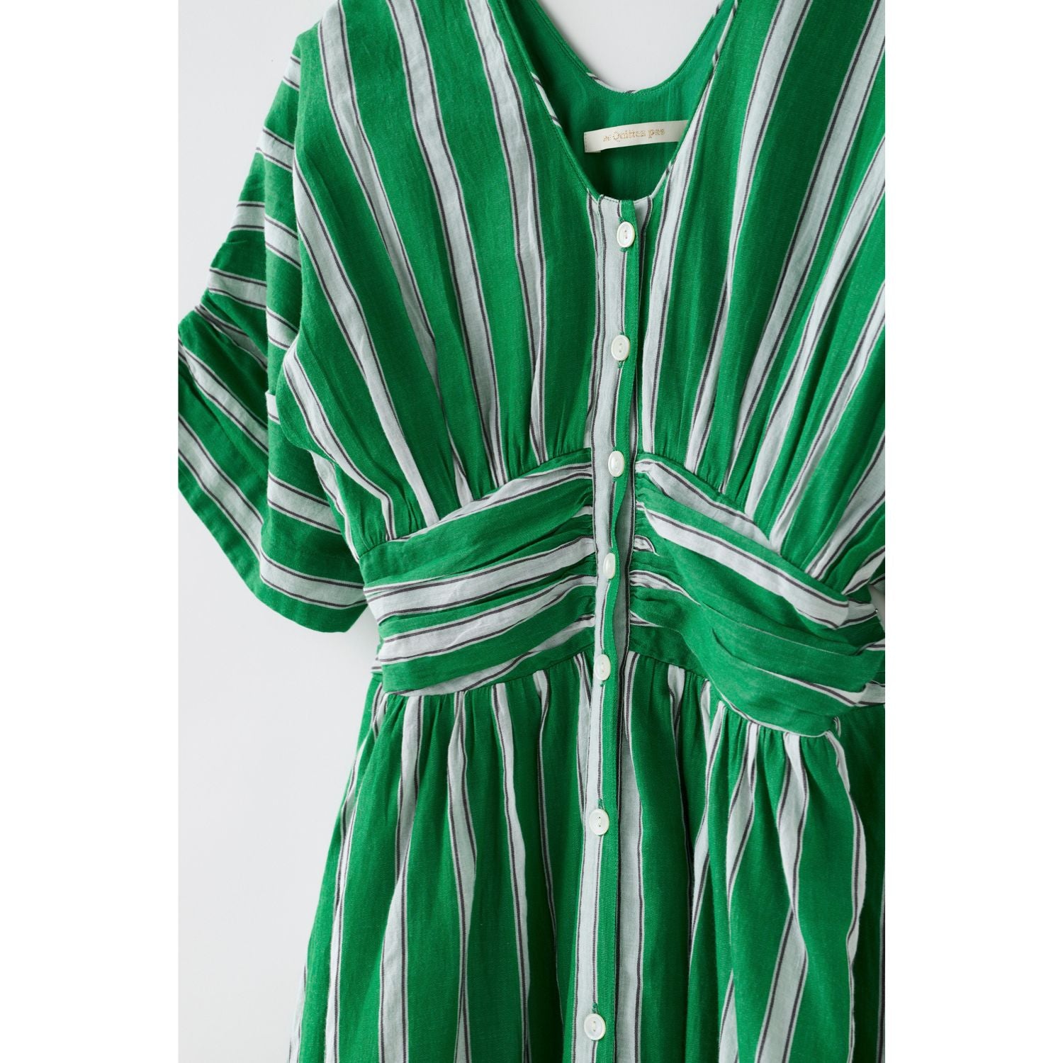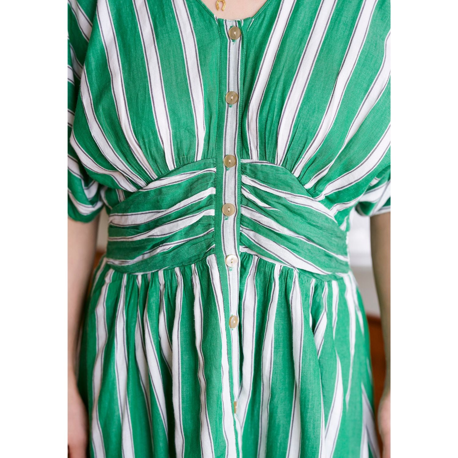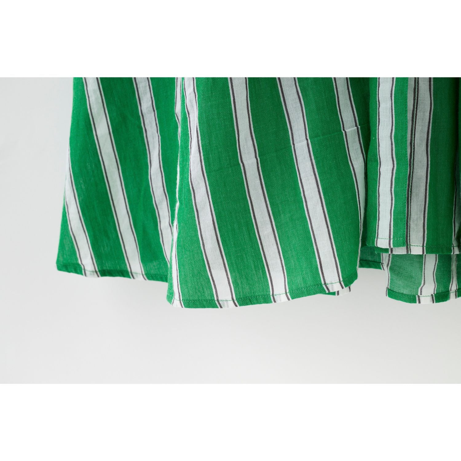 東京で出会って以来、パリの街でも旅先でもピクニックでも着続けているお気に入りの柄です。グリーン×白のストライプは一見派手に感じるかもしれないですが、緑も白もほんの少しくすみを含んだカラーなので、華やかだけど変に悪目立ちもしないところが絶妙なんです。