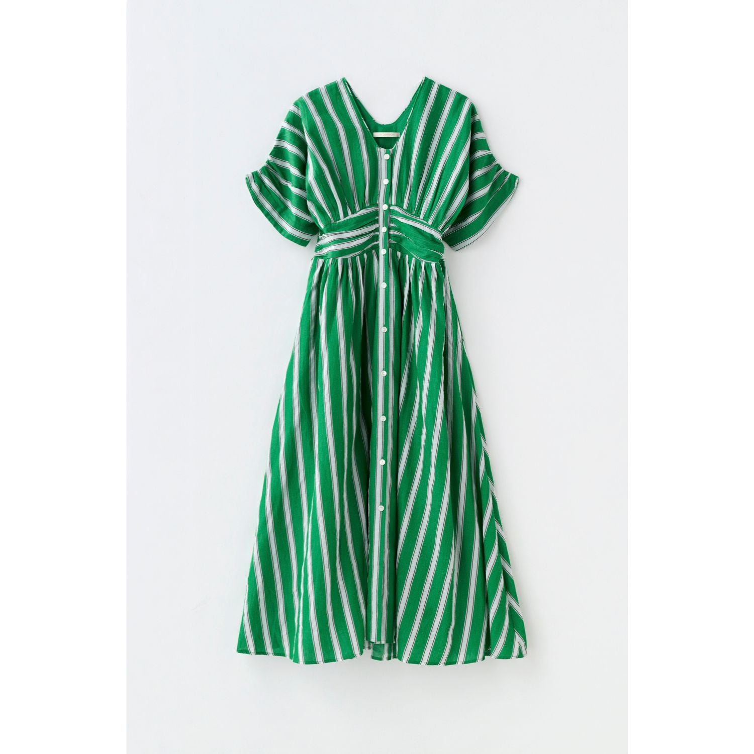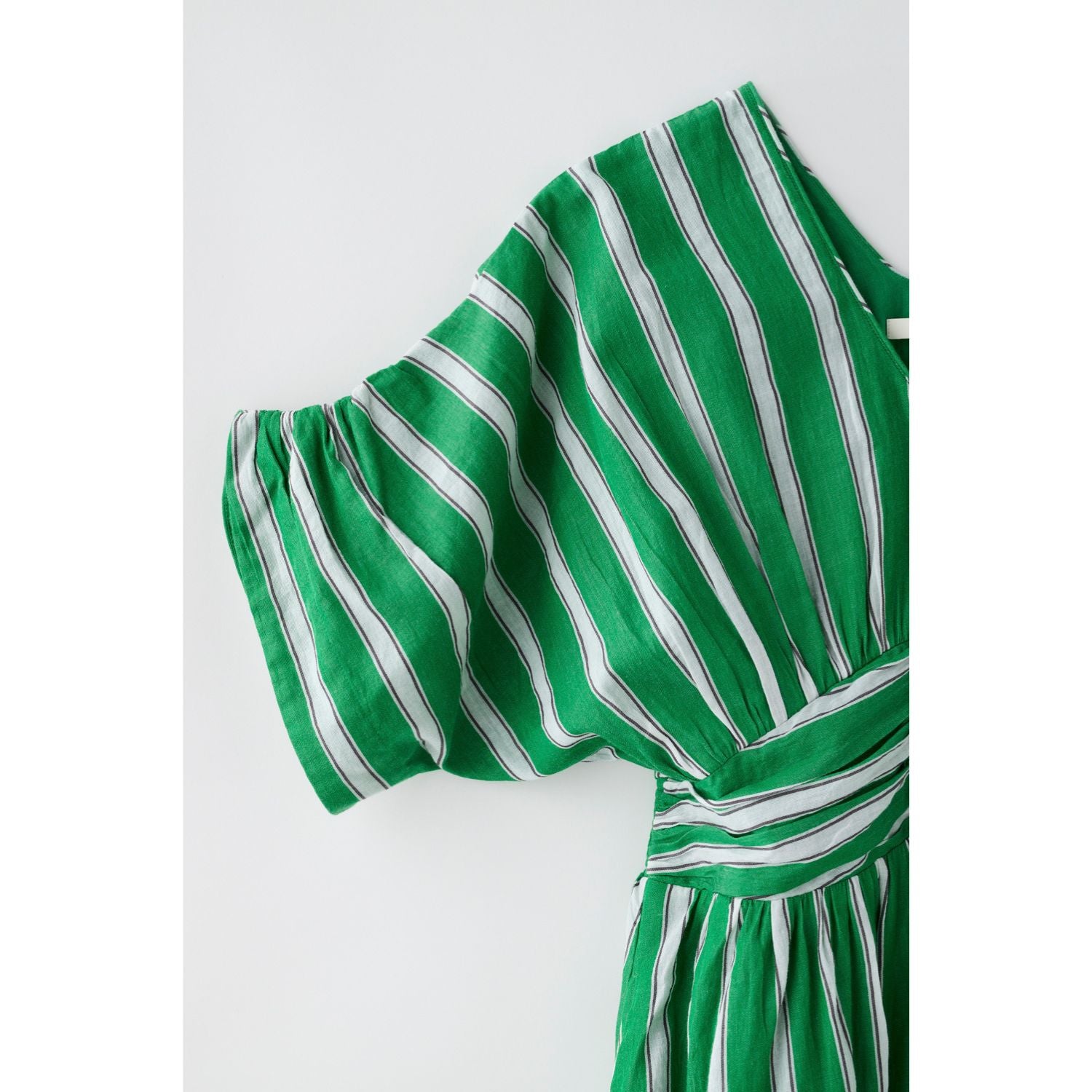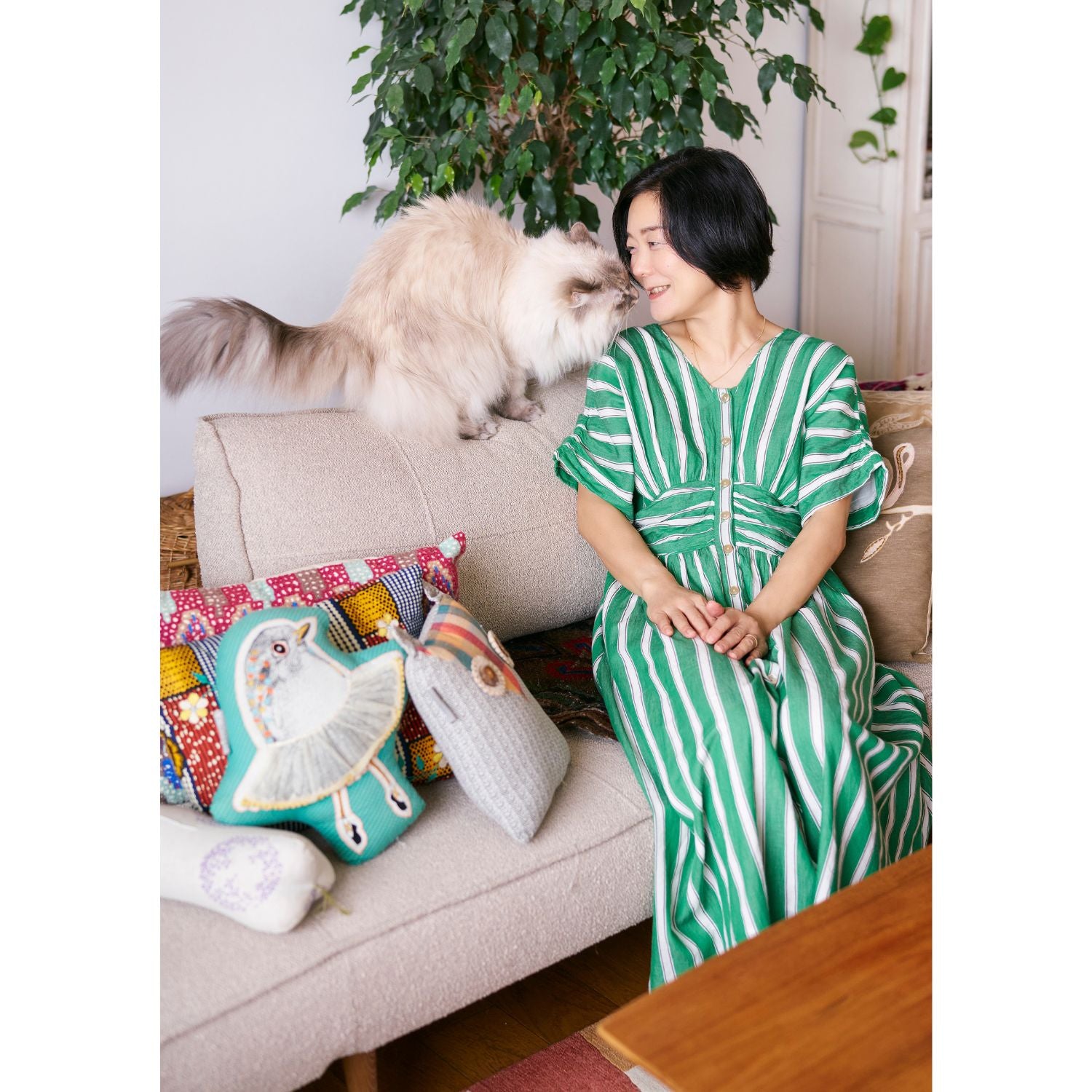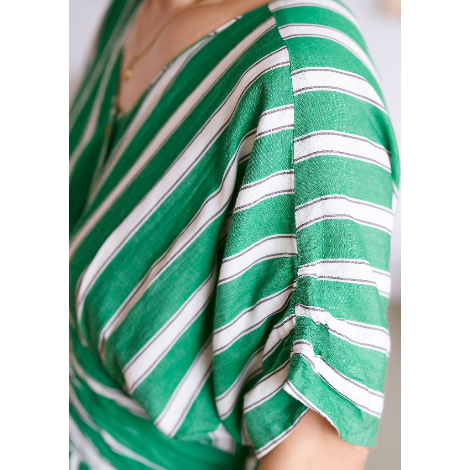 東京で出会って以来、パリの街でも旅先でもピクニックでも着続けているお気に入りの柄です。グリーン×白のストライプは一見派手に感じるかもしれないですが、緑も白もほんの少しくすみを含んだカラーなので、華やかだけど変に悪目立ちもしないところが絶妙なんです。