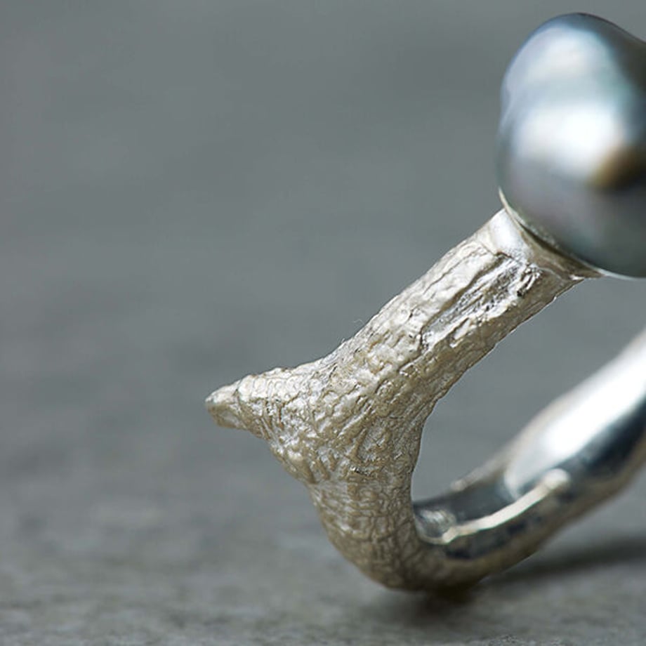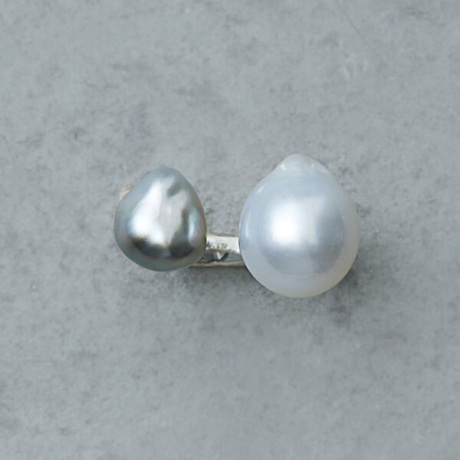 [大小ふたつのパールが指先を華やかに飾る]白蝶バロックパールと黒蝶のケシパールのコンビネーションが指先を品よく華やかに彩ってくれるこちらのリング。指先にはめてみると、角度によってさまざまな表情が楽しめるのも魅力です。左から見ると大小の大きさやパールの色の差が楽しめ、右から見ると白蝶バロックの自然美を主役に、そして真上から見ると指先にまるでパールが2つ乗っているかのようなデザインに。こちらのリング部分も枝から型を取って仕上げており、女性的なパールと涼しげでクールなシルバーの二ュアンスが360度美しいリングです。