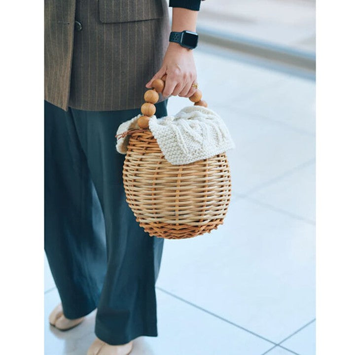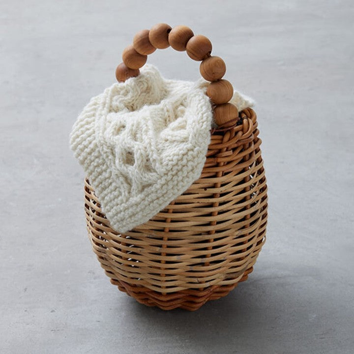 ※付け外しが可能なニットカバーは、ネパールでのハンドメイドでの制作のため制作出来る数に限りがあり、数量限定での販売となります。 ※ニットカバーとかごバッグは、ニットカバーのハトメに繋がっているレザーのひもをかごバッグの持ち手につけて接続します。ニットカバーはつけ外しも可能ですので、かごバッグ単体でもお使いいただけます。 ※ニットカバーは1点ずつハンドメイドでの制作のため、個体差があります。あらかじめご了承ください。 ※前回販売した「ヒツキのニットカバー付きかごバッグ」と一部のかごの素材が異なります(かごの上下がアケビから籐に変更しています)。商品画像を必ずご確認ください。 ※ハンドメイドでの製作のため、かご本体の大きさには前後2cmの誤差がある場合がございます。 ※天然の素材を使用しているため、籐とあけびの素材に、一部スレやささくれがある場合がございます。ご了承ください。