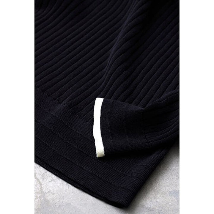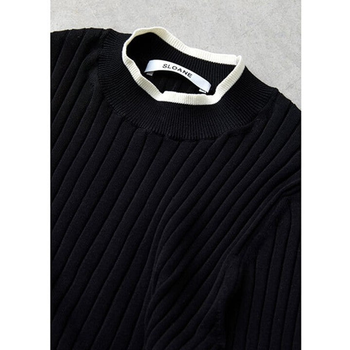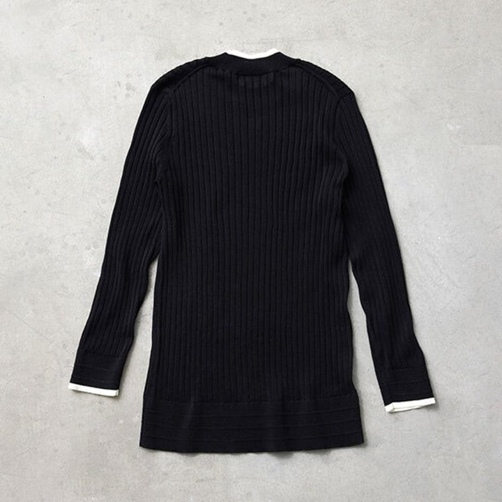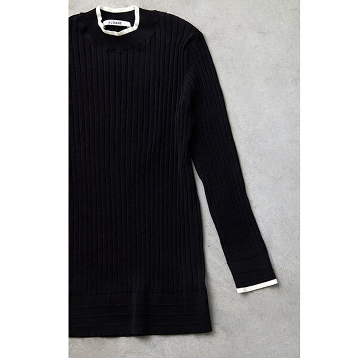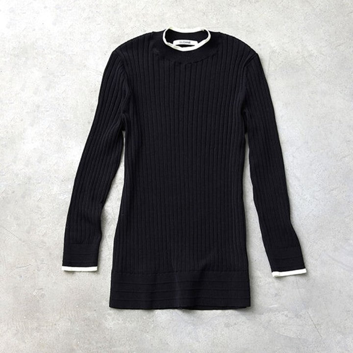 【ベースはノーブルな黒。首元と袖口に白のアクセントを効かせて】デザインポイントのひとつは、首元と袖口に効いた白のバイカラー。ノーブルな黒地に入ったシックな白のラインは、上品でクラシカルな印象です。白のラインはまるでレイヤードをしているようなアクセントとなり、ジャケットの下に着ても、1枚で着てもサマになります。また、首元のラインは顔まわりを明るくしてくれるネックレスのような効果があり、コーディネート要らずです。デザイン自体はシンプルなので、どんなボトムスとも相性抜群。キレイめなパンツからデニム、スカートと合わせるボトムを選びません。スローンには既存商品に半袖のリブニットがありますが、ミモレでは今回七分袖でのオーダーに。そのため春から秋まで、長いシーズン愛用いただける1枚となっています。また、通常商品ですと裾にもラインが入っていますが、ミモレ別注では裾は黒のままでオーダーさせていただきました。