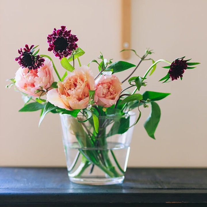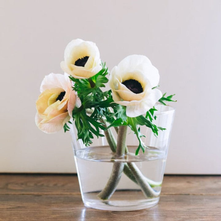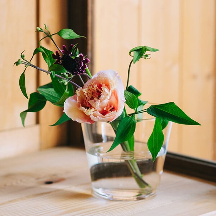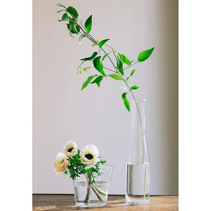 ブーケはもちろん、少数の花から美しく生けられるように作った背の低い「バケツ型」、そして枝をひと枝挿すだけで表情の出る、背の高い「ボトル型」。それぞれで飾っても、2つ飾っても美しい花瓶。花の状態がわかりやすいガラス素材を選び、1つ1つスガハラの職人の手によって吹き上げられています。暮らしの中で、花や枝などの草花を身近に楽しむための花瓶ができました。