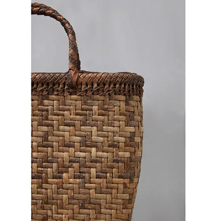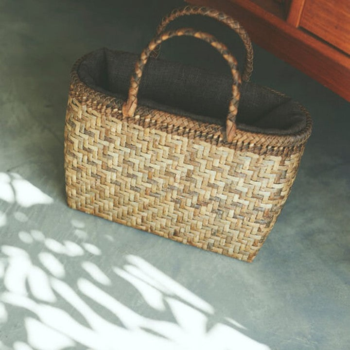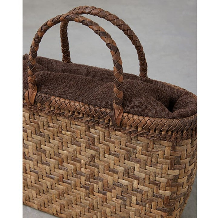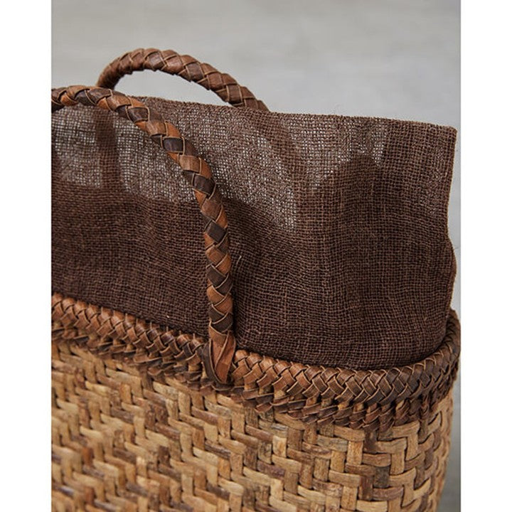 群馬県赤城山、武尊山、皇海山の山奥に自生する良質の自然素材を一本一本丁寧に編んで作られたくるみのかごバッグ。全て手作りのため、一つ一つの出来上がりの表情が異なっています。胡桃皮で編み上げられた籠は使用とともにしなやかさを増し、色は濡羽色に深みを帯びてきます。