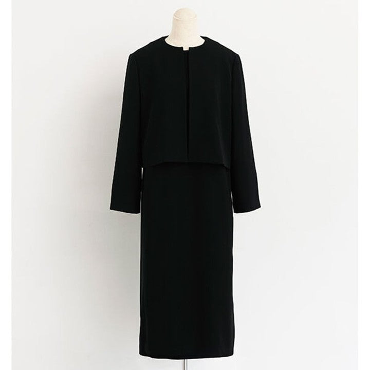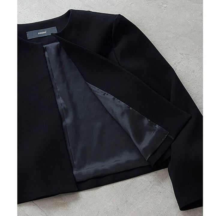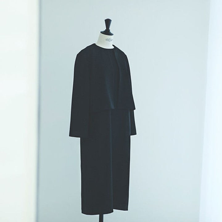 同素材の七分丈のワンピースの丈を長めにしているので、ノーカラーのジャケットは少し短めにして、バランスよく着られるようにしました。またジャケットの袖は、ほんの少しだけ広がっています。おしゃれ感を出そうとして変に何かをあしらったりせず、潔く上質な素材とデザインの美しさでおしゃれに見せてくれる一着です。イタリアのファリエロサルティ社の最高品質のバックサテンジョーゼット生地で、とろみがあり、しなやか。そして光沢がなく、しっかりとした黒に染め上げられています。実はこの生地の色名は「ジェットブラック」。漆黒の宝石、モーニングジュエリーと呼ばれる“ジェット”(和名:黒玉)が由来です。