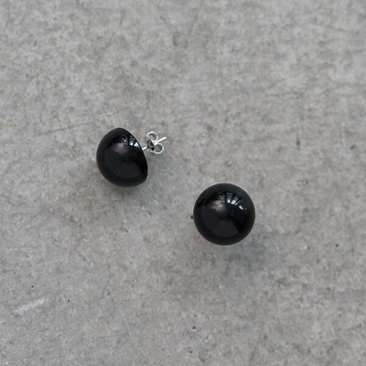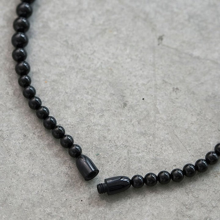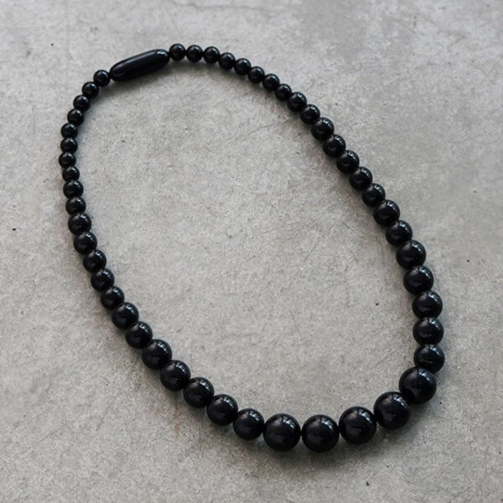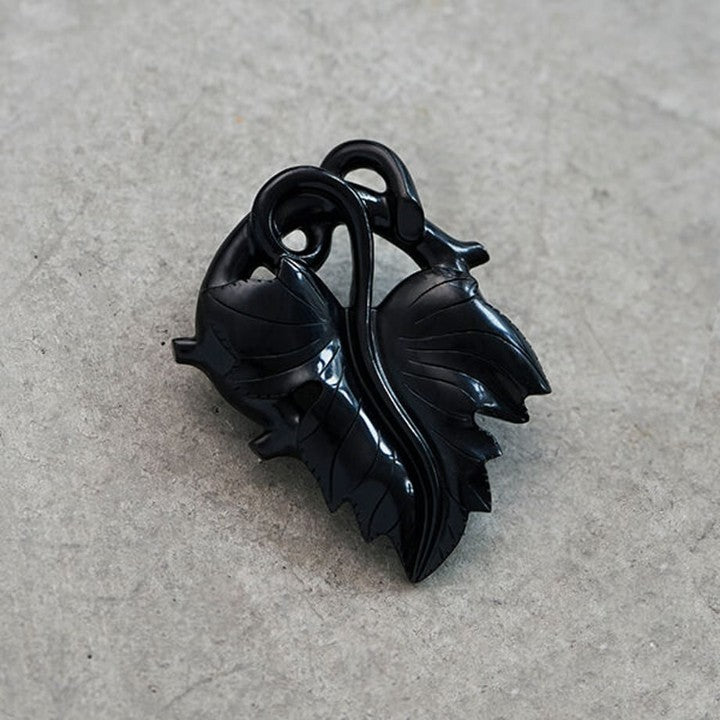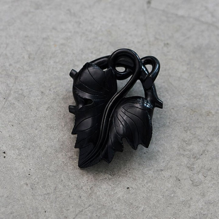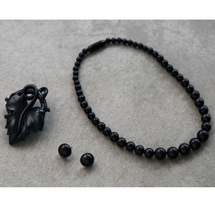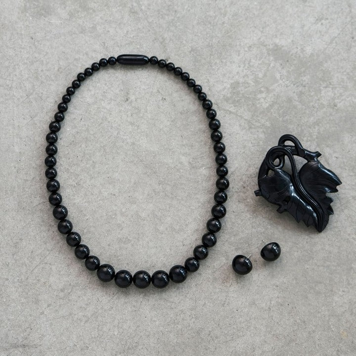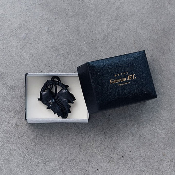 丸玉が美しいグラデーションになったネックレスは首元に自然に添い、正面からも、そして横顔もすっきりと見えます。 ジェットは原石の状態ではマットですが、磨くことでその部分が艶を帯びます。故人を哀悼する気持ちに寄り添うような、気品溢れる落ち着いた漆黒の輝きです。ジェットは100年以上その品質が変わることなく次世代に引き継げる宝石。世代を超えた普遍的なデザインは、まさに定番と呼ぶにふさわしい一本です。14ミリの丸玉をドーム型に研磨したピアスは、ネックレスとセットで身につけたときにバランスのよいサイズ感。控えめながら、耳元にぴったりとフィットし、気品ある輝きを放ちます。ピアスとイヤリングの両タイプからお選びいただけます。「穐葉アンティークジュウリー美術館」所蔵のヴィクトリア期のデザインを復刻したブローチ。豊穣のシンボル、葡萄の葉がモチーフになっています。ブローチを身につけることでよりフォーマルな場に相応しい格式高い装いとなるため、今回ブローチを付けた3点のセットもご用意させていただきました。
