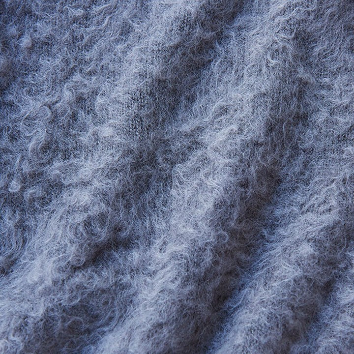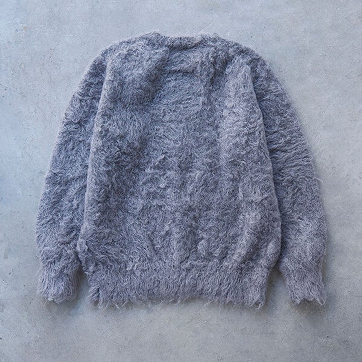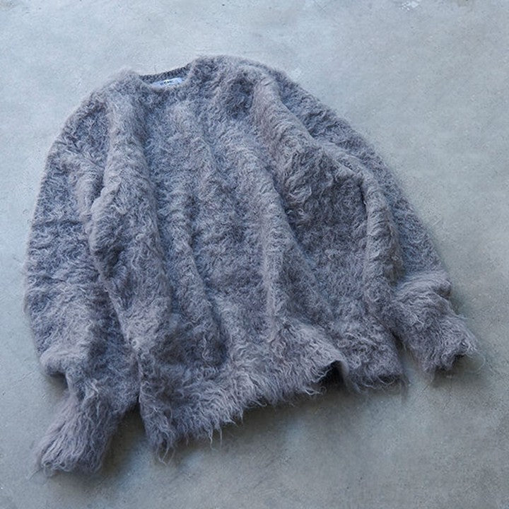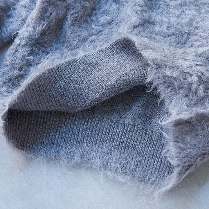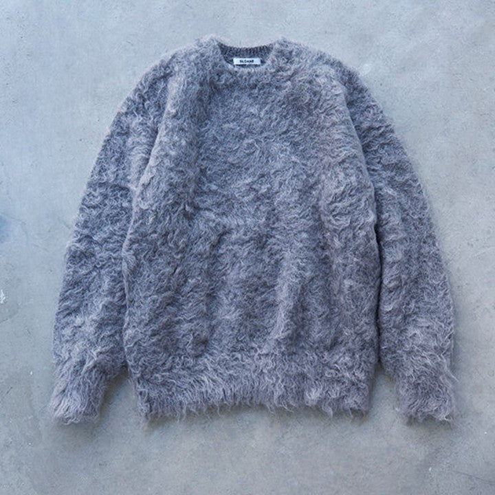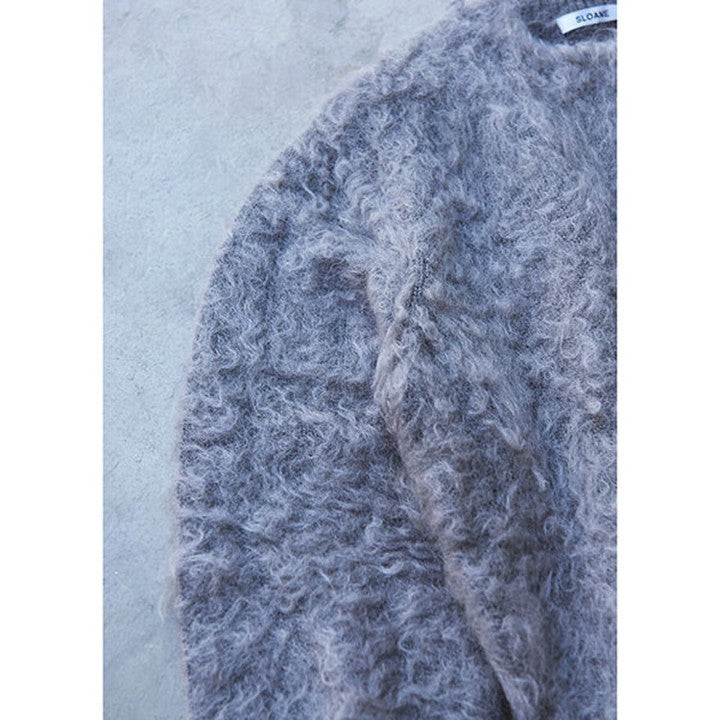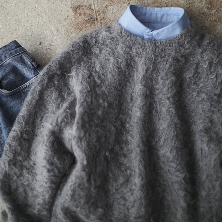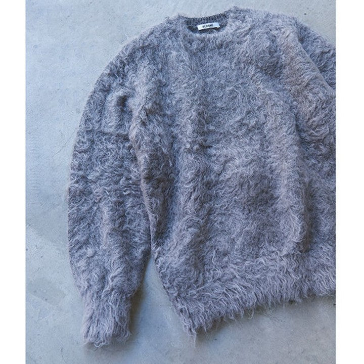 今回のモヘアニットの最大の特徴は、通常よりも長めのキッドモヘアの毛足を使い、独自の加工によりカールさせた風合い。ここまでくるっとカールしているモヘアはあまり見かけることがありません。この加工は、「スローン」でもこの冬初めて採用されたもの。一度ニットが完成した後に、別の工場でモヘアの毛足をヘアリーにカールさせてボアのようにし、圧力や摩擦を加えて収縮させることで、よりソフトにふんわりとした風合いを出す縮絨加工を施しています。そのため、長い毛足がふわっとやわらかく、甘さのある柔らかな見た目に仕上がっています。冬になると多く見かけるモヘアニットですが、このやわらかなカール感はスローンの独特な風合い。海外からの選りすぐりの糸を使い、技術の高い国内工場で織り上げる「スローン」ならではの1枚です。