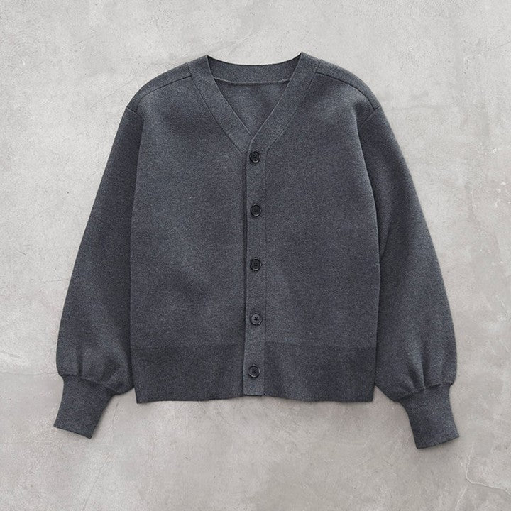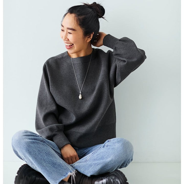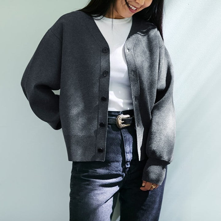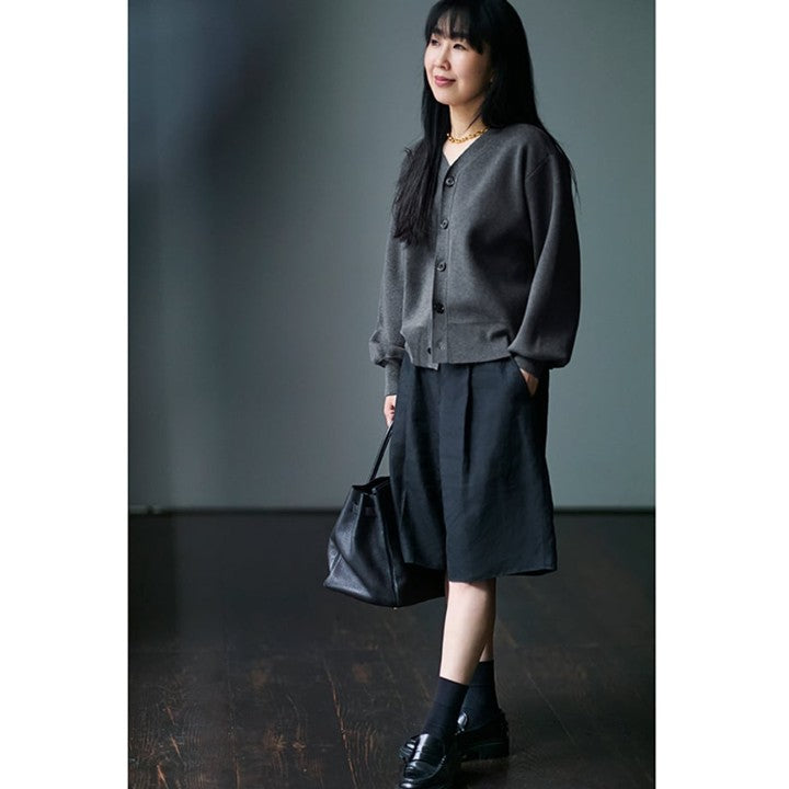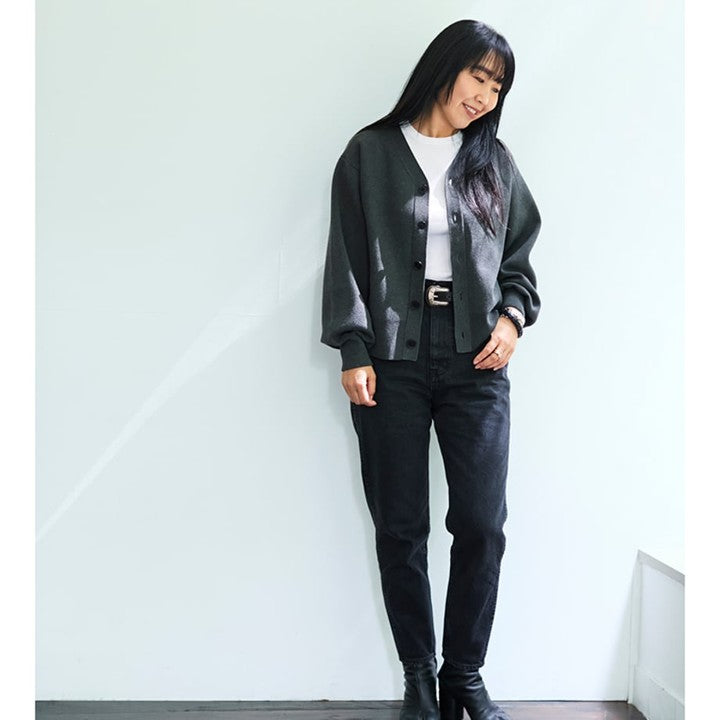 ネイヴのディレクターを務めるスタイリストの福田亜矢子さんと「私たち大人世代が着やすいカーデって何だろう?」と意見を交換しながら、理想の一枚を追及! 色は黒よりも優しげに見えて、引き締め効果もあるチャコールグレーに。形は羽織りとしてはもちろん、ボタンを閉めれば一枚で着られる浅めのVネックにしました。クルーネックより首元に抜け感が出て女らしく見えますし、顔まわりもすっきり見せてくれます。滑らかな表面感で毛玉にもなりにくい素材は、適度に地厚なのでヨレたりシワが気にならず、扱いも楽ちんです。ノンストレスな着心地なのにきちんと見えて、きゅっと腕まくりもできるからお仕事シーンにも重宝します。(福田麻琴さんより)