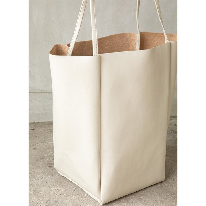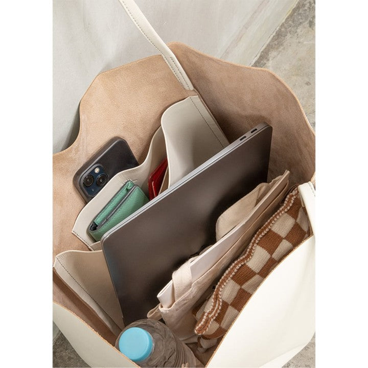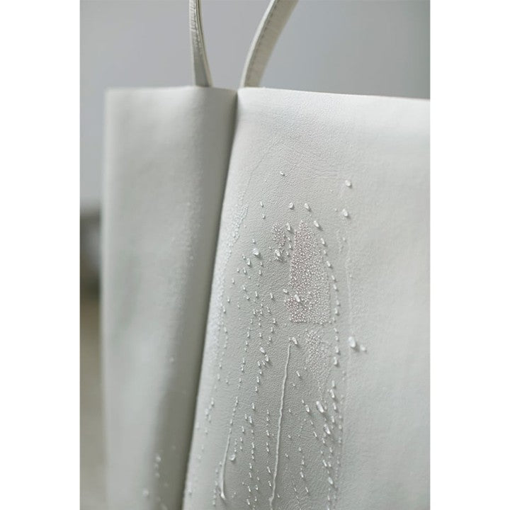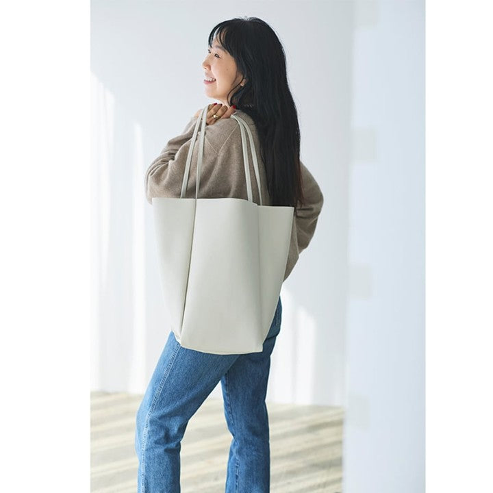 ミモレ別注バッグには、PadやPCが収納できるワイドポケットを追加でオーダー。(PCを持ち歩かない人は、ワイドポケットにリップやミラーなど細々したものをまとめて入れても!)A4がすっぽり入るので通勤バッグとしても最適です。一般的に底板のないトートバッグは重いものを入れると中身が沈んでバッグが型崩れしがちですが、スキューのトートはバッグ底に工夫がされていて、沢山荷物を入れても変形しにくい仕様となっています。素材は耐久性に優れた国産の人工皮革(天然皮革の構造を人工的に再現した素材)を採用。耐水性があるので、ある程度の汚れは水で落とすことも可能です。汚れや黒ずみが気になる淡色バッグこそ、リアルレザーより扱いの楽な人工皮革を選ぶことで綺麗な状態を長く保てます。