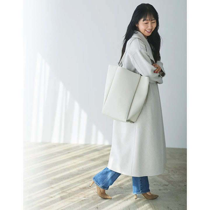 約400g(レモン約2個分)という驚きの軽さで、持っていることを忘れるほど。年齢と共に重いバッグが持てなくなってきた方や大荷物派にもイチオシです。金具なしのミニマルなデザインは合わせるジュエリーを選ばず、毎日の着こなしにさらりと寄り添ってくれます。