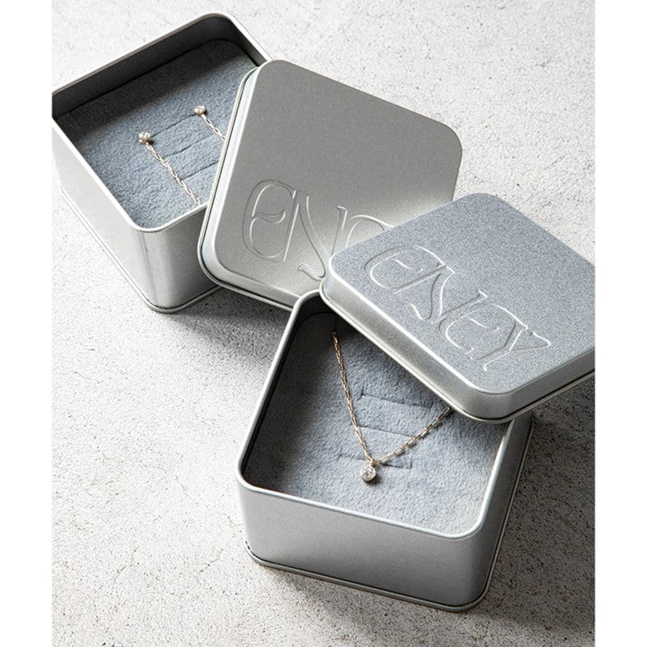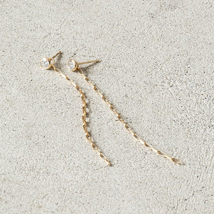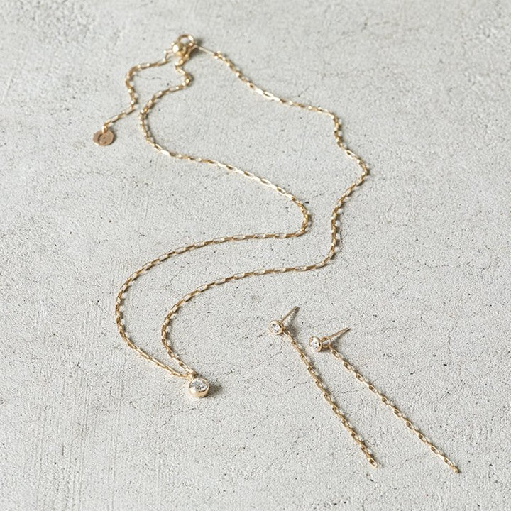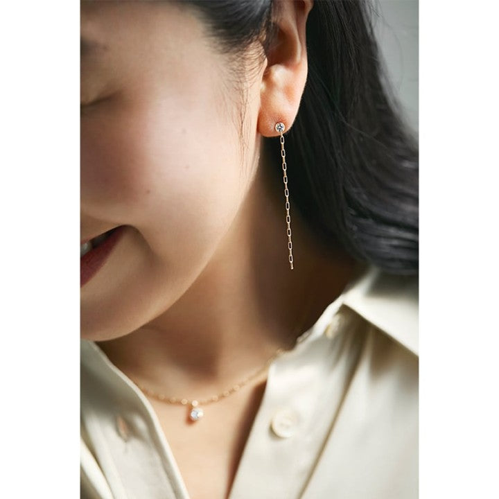 ネックレスとセットで楽しめるチェーン付きピアスはネックレス同様、スタイリッシュな仕上り。0.1カラットのダイヤモンドを使用し、華やかな存在感があるのが特長です。チェーン部分はネックレスと同じものを使っており、長めかつ揺れ感があるので、パーティーシーンなどいつもよりゴージャスに顔まわりを盛り上げたいときに最適。アップヘアに合わせると、よりその華やかさが際立ちます。