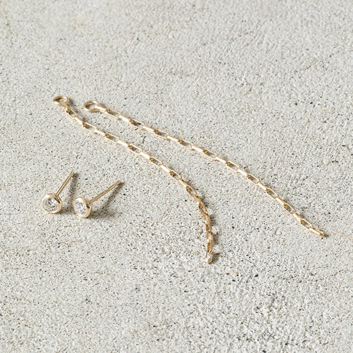 また、チェーンを外せばシンプルで使い勝手のいい一粒ピアスとして使えるほか、チェーンを手持ちのピアスと組み合わせて使っても。1セットで様々な楽しみ方ができるので、なんでもない普段着カジュアルにも、通勤服にも、そしてハレの日スタイルにだって合わせられて重宝します。