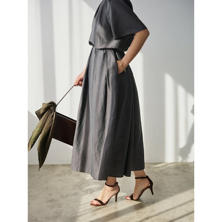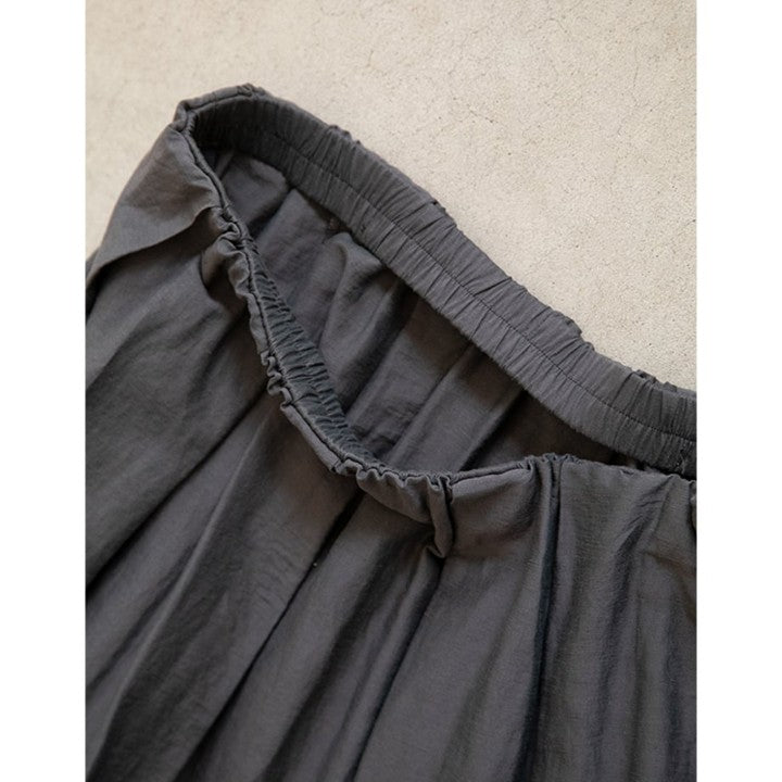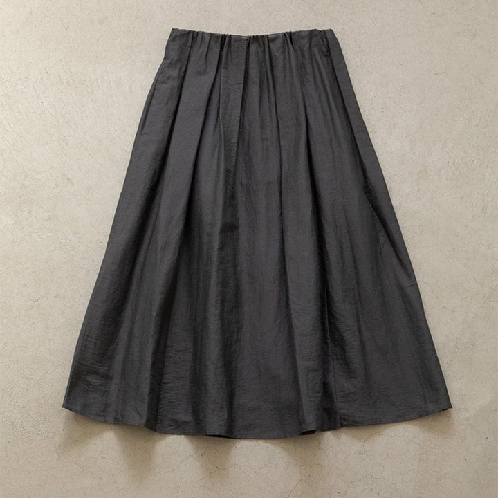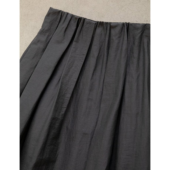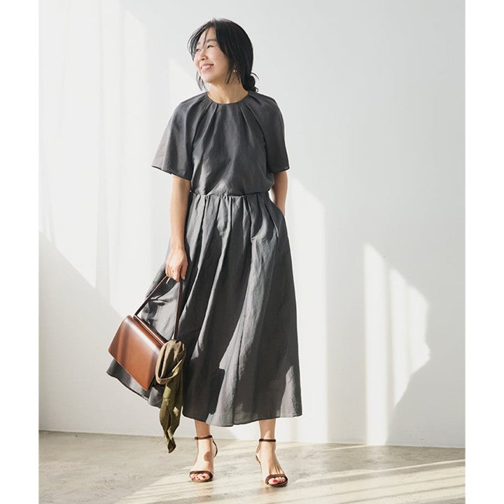 「こだわりポイントのひとつめは、素肌に快適な素材であること。表面に少し凹凸のあるリネン混の生地を選びました。さらりとしていて肌離れが良く、汗をかいても快適に過ごせます。ふたつめは、風が通り抜けるふんわりとしたシルエット。ブラウスの胸元にドレープを効かせ、スカートはウエストギャザーをたっぷりととって、中で身体が少し泳ぐようなデザインにしました。スカートはぐるりと一周ウエストがゴムなのですが、ゴム感の目立たない仕様&ギャザーが上から入っているため、トップスをウエストインした時も収まりが良くきれい。単品使いはもちろんのこと、上下セットアップで着るとよりきちんと見えするので、ジャケットを羽織ってのお仕事シーンにもおすすめです。」福田麻琴さんより