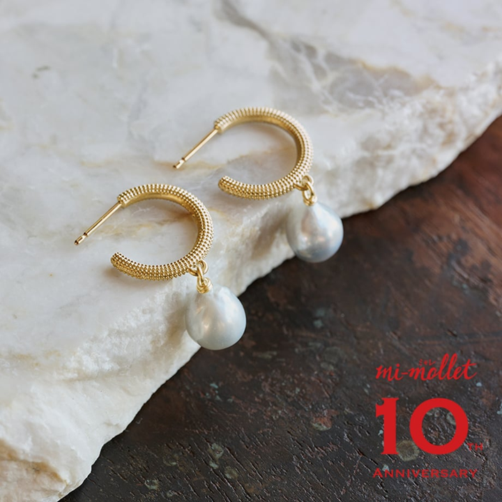 ミモレ10周年記念として、このたび「ボンマジック」とのスペシャルなコラボジュエリーが発売決定! 今回ご紹介させていただくのは、ボンマジック代表の白井成実さんにスタイリストの福田麻琴さんがデザインからご相談した「白蝶バロックパールフープピアス」です。表面が凹凸加工されたフープに、揺れるバロックパールがあしらわれたモダンで華やかなデザインは、カジュアルな場面にもドレスアップのシーンにも不思議とマッチ。いつもの装いが一気にクラスアップするジュエリーが誕生しました。