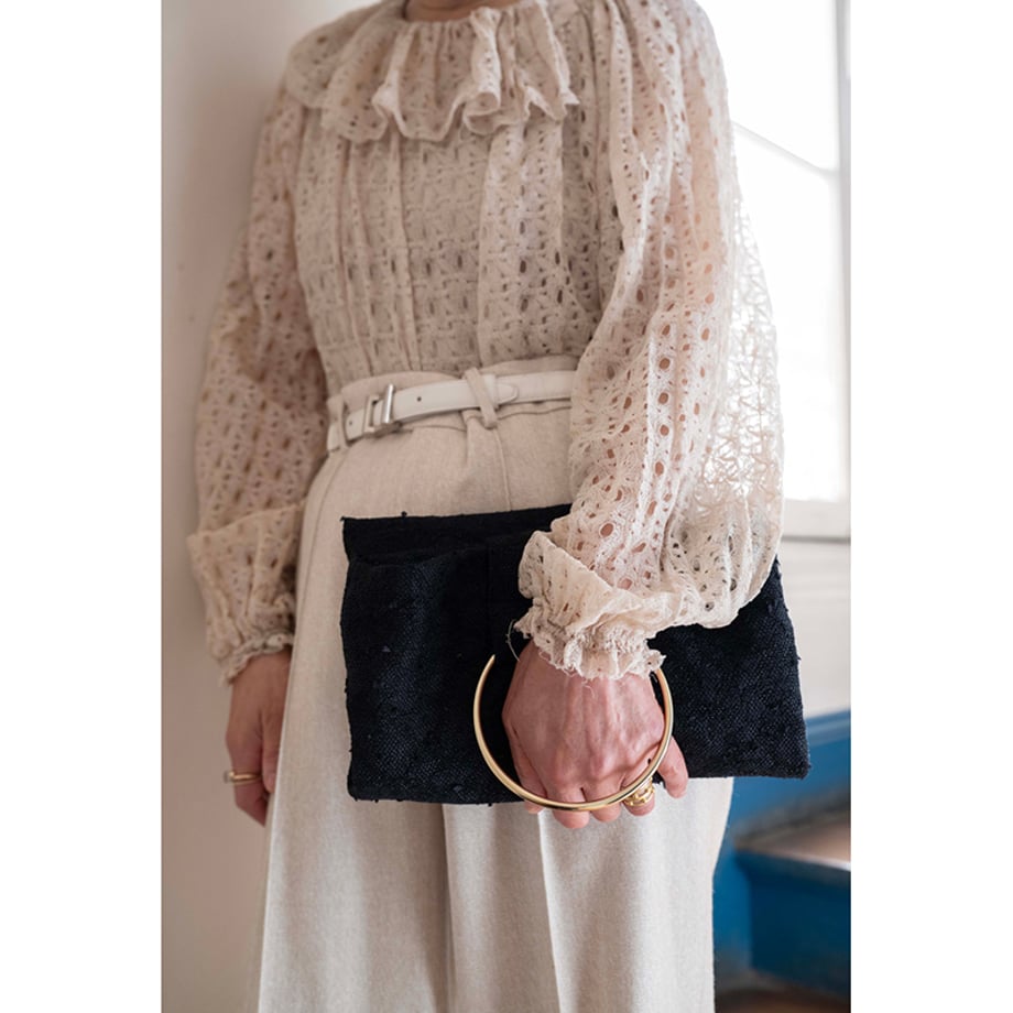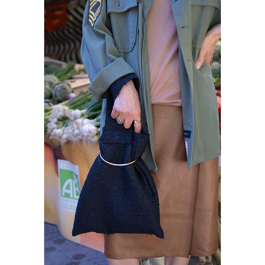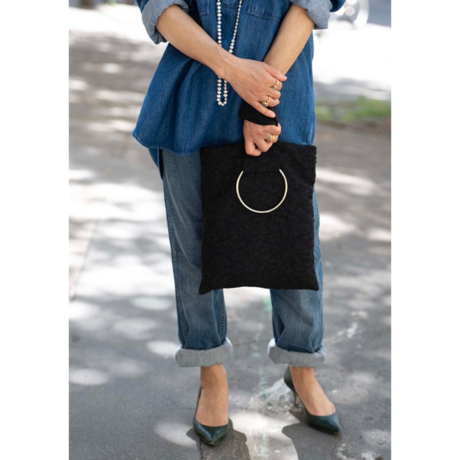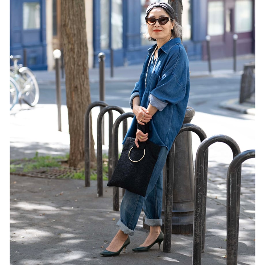 実は大好きなツイード素材はブランド立ち上げ当初からずっと挑戦したかったのですが、今回初めて起用する素材なんです。ミモレさんのほうから、ツイード素材で別注したいとリクエストをいただいて。タイミング的に「今なら」と思って探し始めたのですが、とても良い生地に出会うことが出来て、今回の別注が実現しました。控えめなキラキラ感のあるツイードは、大人の女性を素敵に見せてくれる素材。黒1色なので使いやすいですし、どんなスタイルにも合います。荷物も意外とたっぷり入って丈夫なので、私は仕事帰りにマルシェに寄って、買った野菜を入れたり、ワインボトルを持ち運んだりなんかもしちゃってます(笑)。折りたたんでかさばらないので、旅行やバックインバッグにも重宝しますよ(チャコさん)