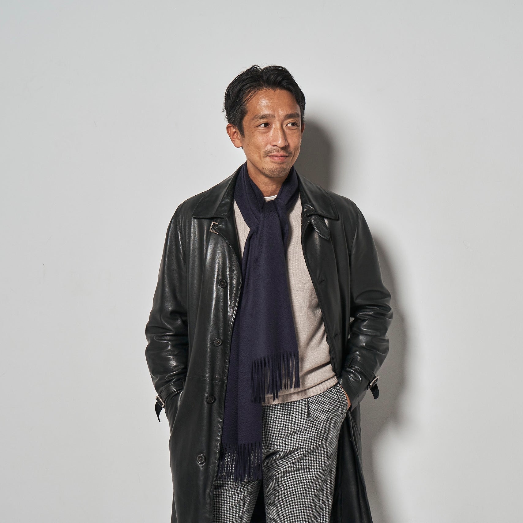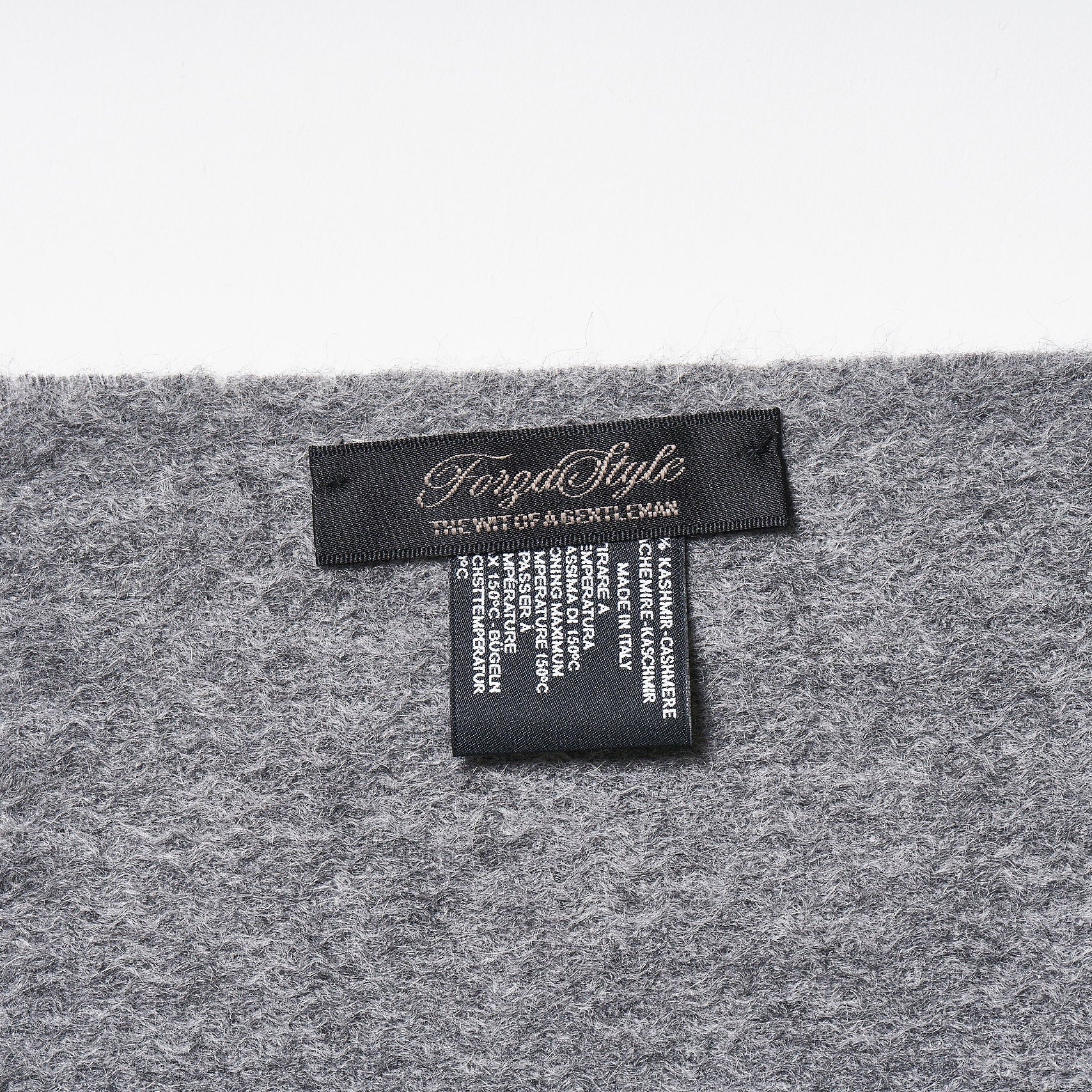 諸澤が生地の聖地・イタリア ビエラ地方の問屋で偶然出会った、極めて上質なカシミアマフラー。その出所を辿るうちに判明したのは、ルイ・ヴィトンやエルメスなど、名だたるメゾンブランドのOEM生産を手がける巻物専業のファクトリーでした。