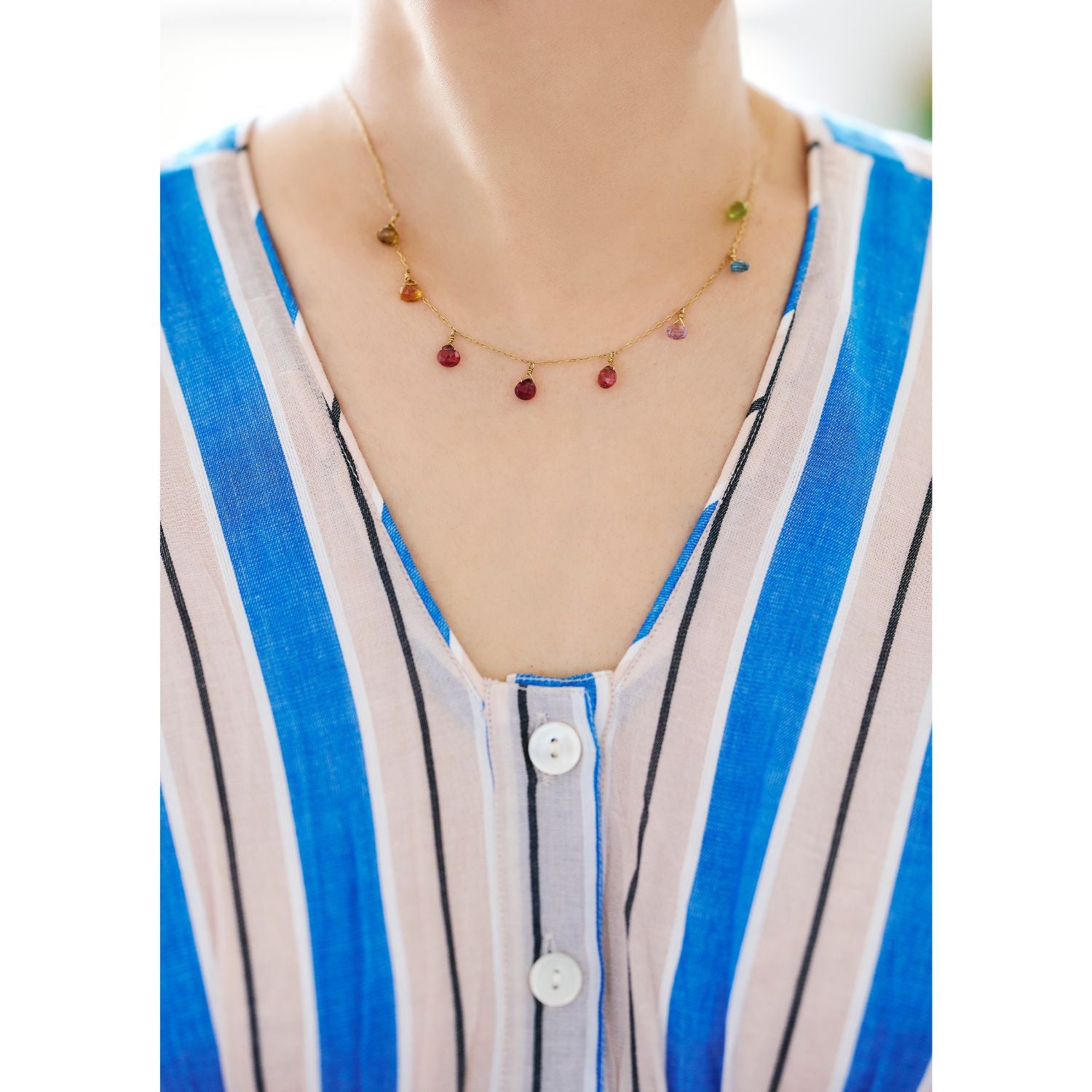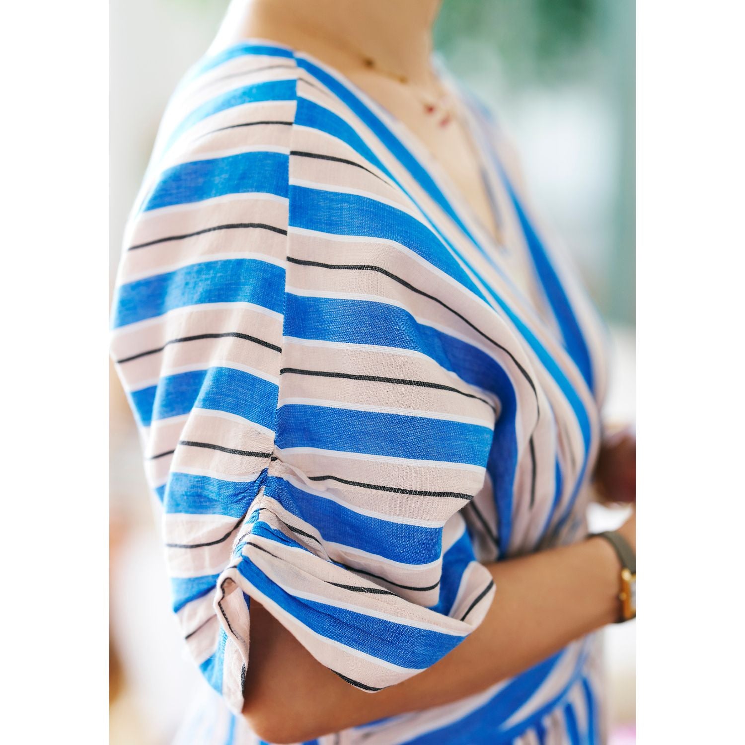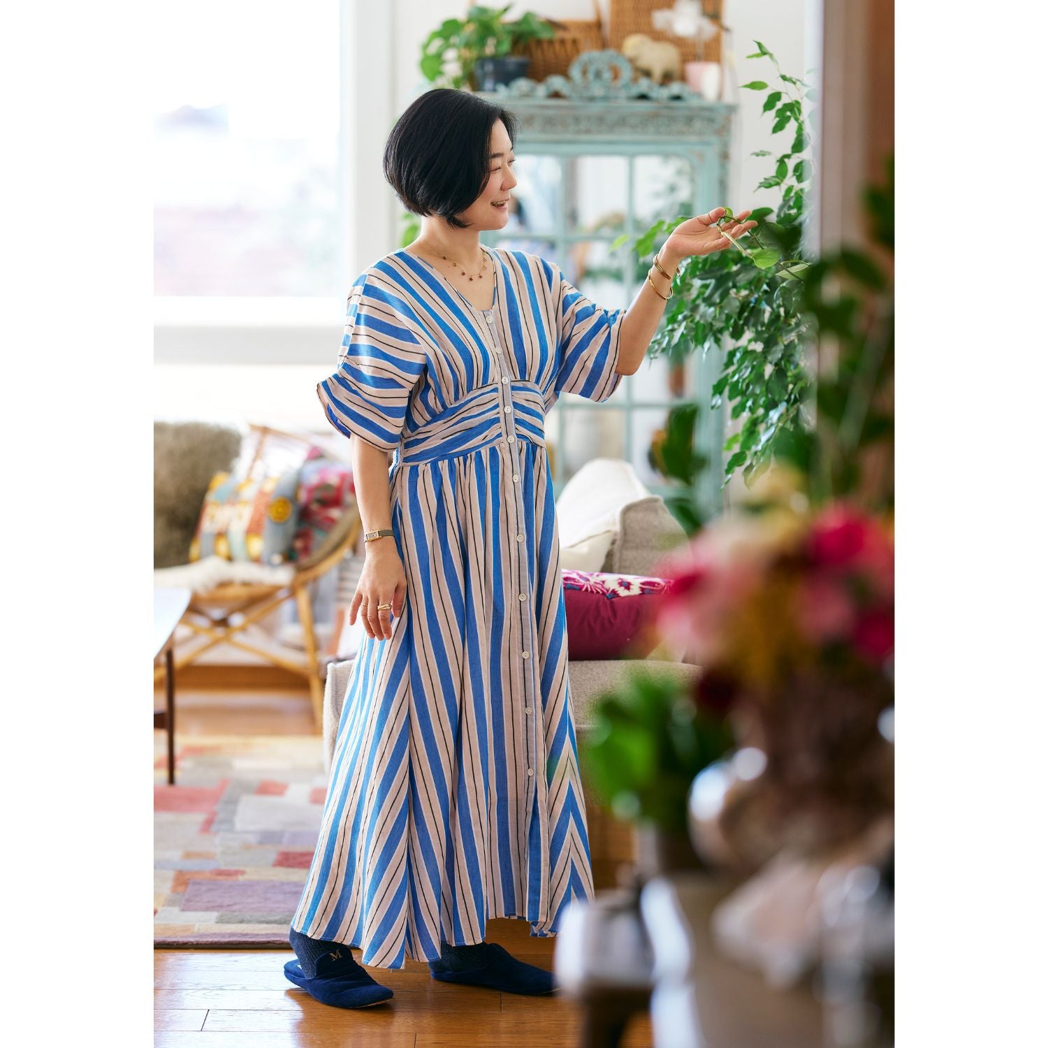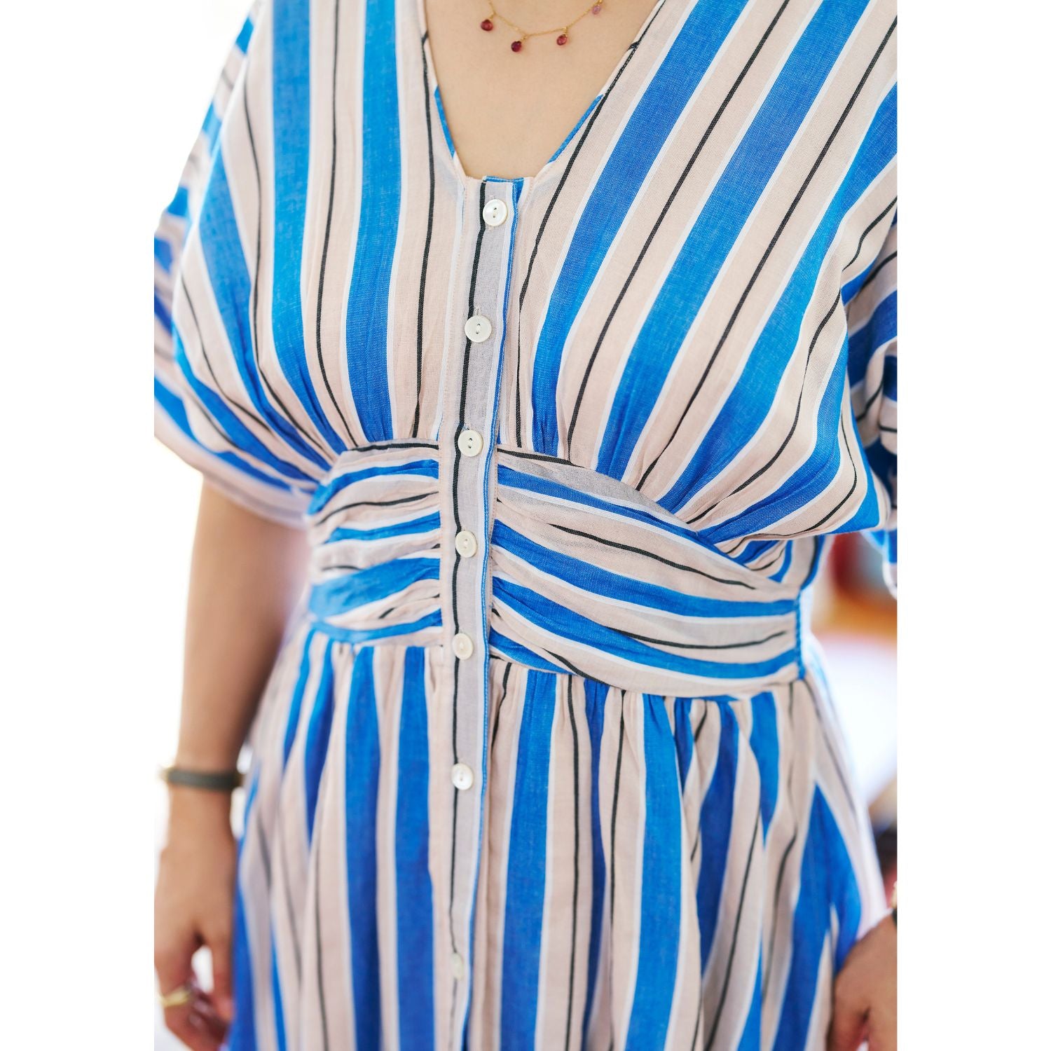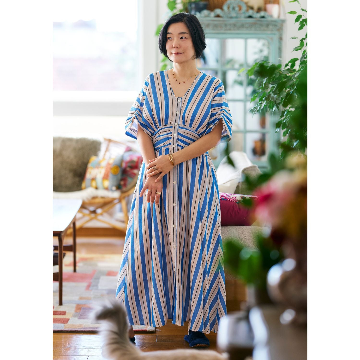 <Mamikoさんコメント>夫にも「可愛いね!」と褒められた(笑)、新柄のブルーストライプ。ブルー単色のストライプではなく、ベージュも入っているのでパキッとし過ぎず、どこか優しい雰囲気に見せてくれるところがいいなと思いました。華やかではあるのですが、ブルー、ベージュ、白、黒と入っている色がすべてベーシックカラーなので、普段あまり“色”を着ない人にも比較的取り入れやすいんじゃないかなと思います。ふわっとウエスト周りを覆う胸下のギャザーはアクセントの役割もしてくれるから、どんな体型でもスタイルよく見せてくれます。また、Vネックの幅が狭いので、顔はすっきり見せてくれるのにデコルテのソゲはカバーしてくれるのも嬉しい。そしてなんといっても、家でザブザブ洗えてがばっと着るだけでサマになる、という楽さも最高!楽で、着映えて、スタイルアップもできちゃう。一石三鳥の一枚です。色柄違いの「グリーンストライプ柄ワンピース」はこちらをチェック!https://k2cstore.com/collections/gorogoro-boutique/products/gb-0002