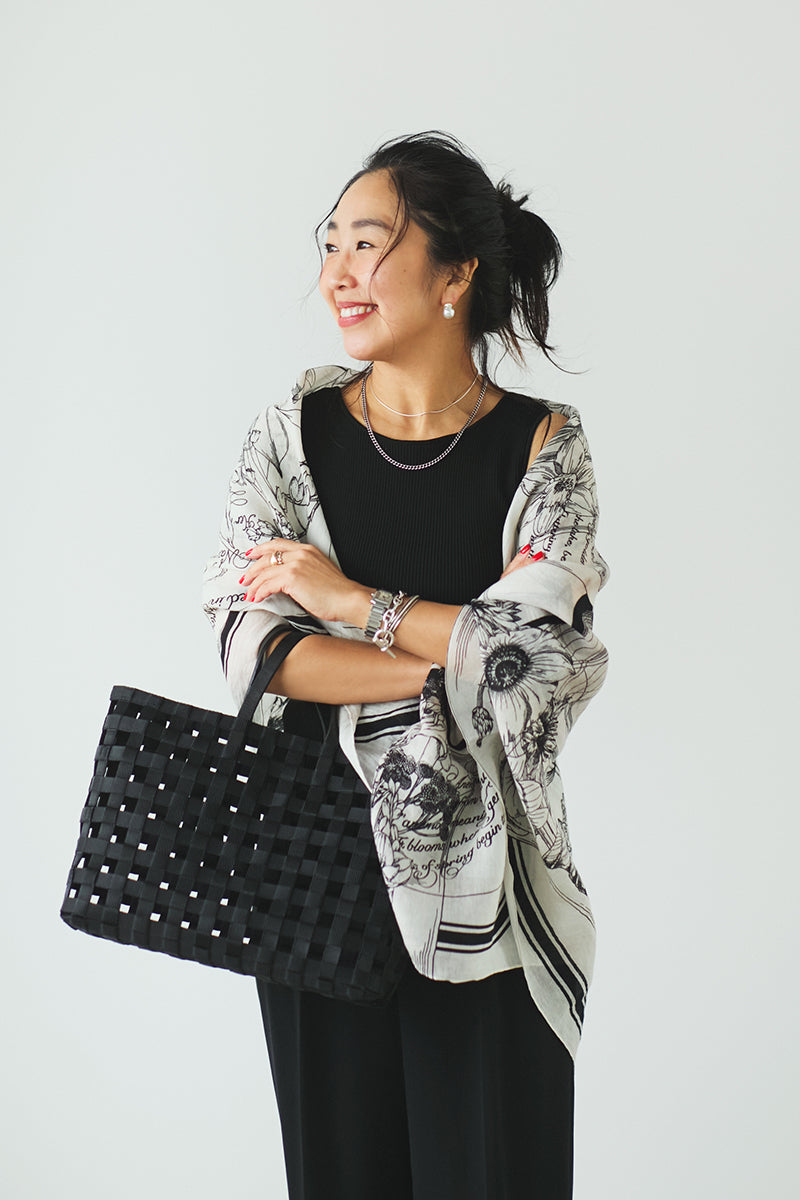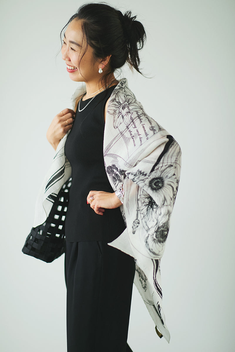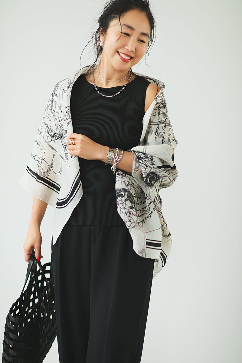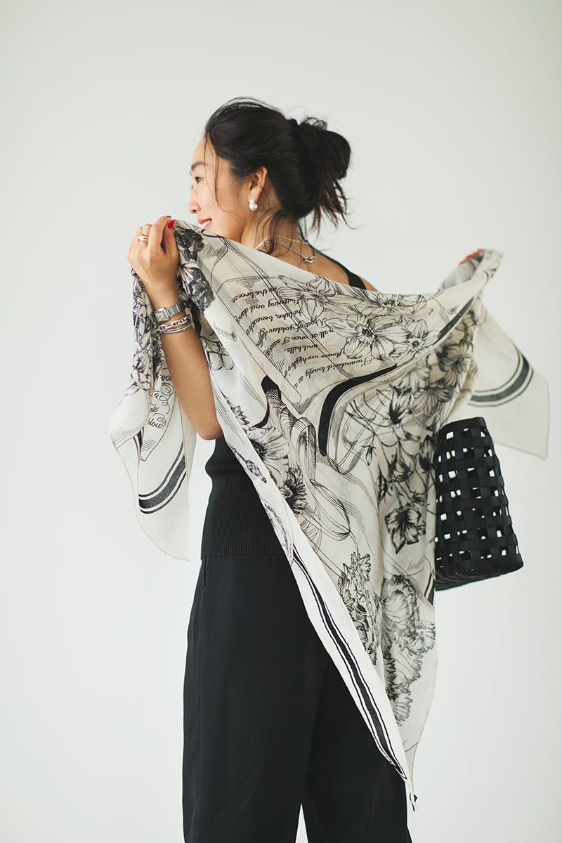 【記事はこちら】白ベースのモノトーンが大人にマストな清潔感を演出! 「マニプリのコットンシルクストール」がミモレストアに新登場https://mi-mollet.com/articles/-/58124ミモレストアに「マニプリ」の大人気アイテム、「コットンシルクストール」が新登場です!今回、スタイリストの福田麻琴さんが豊富な柄の中からミモレのためにセレクトしたのは、爽やかな白ベースのモノトーン柄。大判サイズでありながらしなやかで、ちょっと肌寒い春先の羽織りにもぴったりです。マニプリと言えば、気持ちがワクワクするようなカラフルな色や柄の巻き物が豊富でそれもとても魅力的なのですが、今回は服との合わせやすさやお仕事シーンでも使えることを重視して、あえてシックなモノトーン柄をチョイス。爽やかな〝白ベース〟なので顔まわりがパッと明るく、コーデが華やかな印象になります。120×120㎝の大判サイズなので、ふわっと大きく纏っても素敵!シャツやジャケット、アウターにあしらってアクセントにするのはもちろん、夏は冷房対策や日よけにも活躍します。さらりとしたコットン混素材で風も通してくれるから、素肌に羽織っても気持ちがいいんです。(福田麻琴さん)2枚、3枚と揃えるファンも多いという「マニプリ」のコットンシルクストール。合わせる色を選ばないモノトーンは、プリント柄は苦手という人もチャレンジしやすいはず。無地の服に柄ものをひとつ加えることで、シンプルなコーディネートが一気にお洒落に見違えます。数量限定、期間限定での発売となりますので、気になる方は是非お早めにチェックしてみてくださいね。