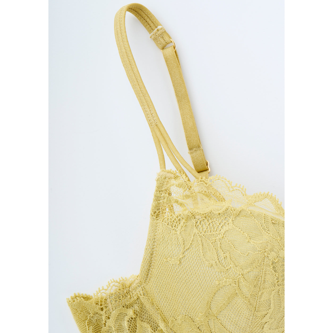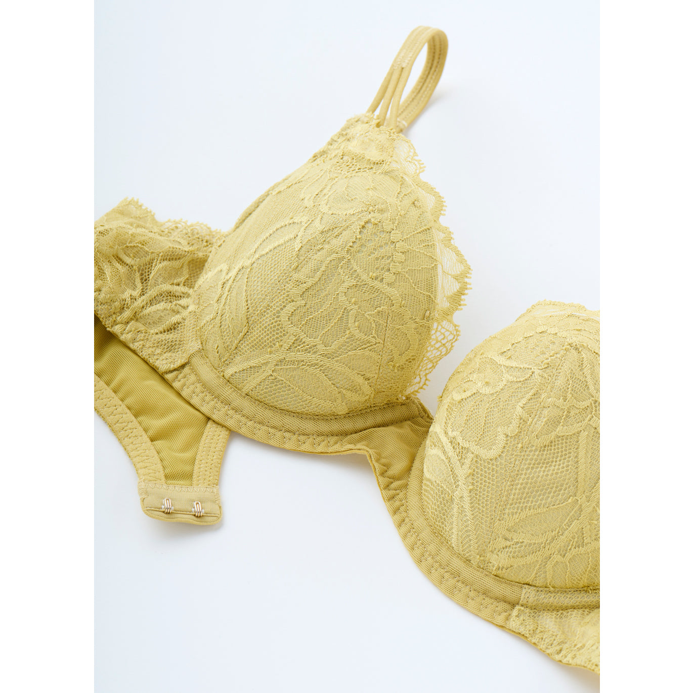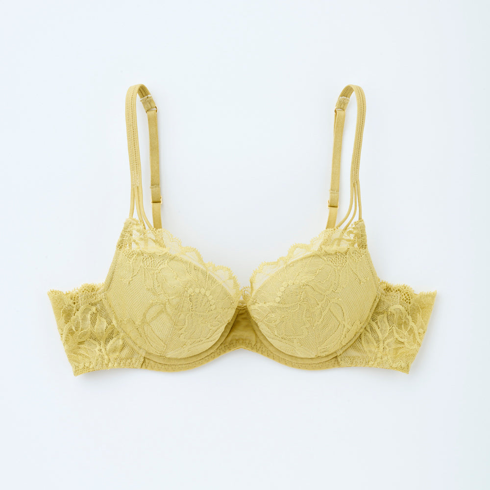 【記事はこちら】「ブラキャミ」よりラクでおしゃれ。盛らない、苦しくない、でも美しい「大人のためのブラ」が誕生!【FLORALE LUXE×mi-molletコラボ】https://mi-mollet.com/articles/-/58626mi-mollet STORE初の「大人のためのラクでおしゃれで美しいブラ&ショーツ」が誕生。コラボしたのは世界的なランジェリーメーカー・トリンプのプレミアムブランド『フロラーレバイトリンプ(FLORALE BY Triumph)』の中でも、肌にまとう究極の贅沢と呼ばれる最上級ライン「フロラーレリュクス(FLORALE LUXE)」です。繊細で優美なデザイン、そしてつけ心地にこだわった「5011」というシリーズから、ミモレコラボとしてニュアンスあるイエローグリーンをご用意。ブラにもショーツにも贅沢に使われているオリジナルのストレッチリバーレースには、花のモチーフがデザインに落とし込まれていて、このシリーズはセルリアの花がテーマになっています。【デザイン&つけ心地POINT】■ストレッチ性の高いオリジナルデザインのリバーレースを贅沢に採用■ゆるやかで浅めのU字ワイヤーなので優しく包み込むから苦しくない■サイドベルトの内側にチュールを配置、チクチクしない、食い込まない■盛らずに、無理のない自然な胸の丸みを叶える3/4カップ■派手ではないけど無難じゃない。他にはない着けていると心躍るイエローグリーン【仕様の詳細】■3/4カップ■ワイヤー入り■パッド無し(パッドポケット有り)■ストラップ付け替え不可(アジャスター有り)■フック数:2段3列同色、同素材のセットになるレギュラーショーツ、ストリングがあります。※裁断の関係上、レースの柄の出方が画像と多少異なる場合があります。